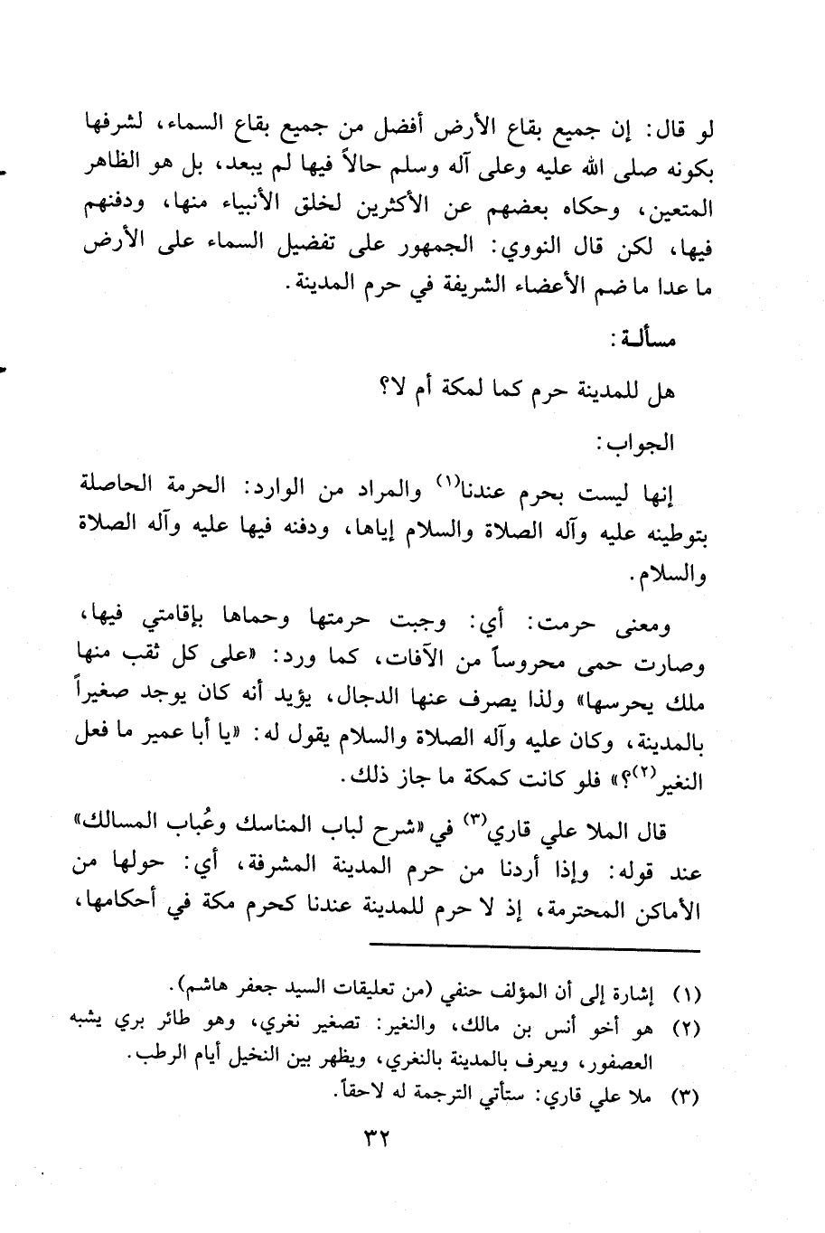 ... قال في ((المواهب اللدنية)): وقد اطلعت في الاحتجاج لتفضيل المدينة على مكة، وإن كان مذهب إمامنا الشافعي تفضيل مكة؛ لأن هوى كل نفس حيث حل حبيبها. على أن للقلم في أرجاء تفضيل المدينة مجالاً واسعاً، ومقالاً جامعاً، لكن الرغبة في الاختصار تطوي أطراف بساطه، والرهبة من الإكثار تصدف عن تطويله، وإفراطه، وأنت إذا تأملت قوله عليه وآله الصلاة والسلام: ((يأتي على الناس زمان يدعو الرجل ابن عمه وقريبه: هلم إلى الرخاء، والمدينة خير لهم لو كانوا يعلمون. والذي نفسي بيده! لا يخرج أحد منها رغبة عنها إلا أخلف الله فيها خيراً منه))0 ظهر لك أن فيه إشعاراً بذم الخروج من المدينة، بل نقل المحب الطبري عن قوم أنه عام أبداً مطلقاً، وقال: إنه ظاهر اللفظ. انتهى.