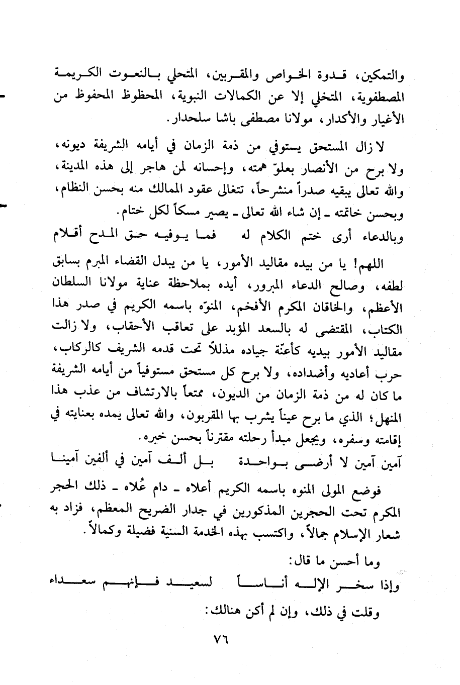 ... حقق الله لنا بآل نبيه، وصلة المحبة التي طبعنا عليها، وأعرضنا عن كل قحامة تقطع عنها نظر إليها، إذ لا فخامة إلا منهم، ولا زعامة إلا عنهم، ومن ثم قال عنهم عمر للحسن - رضي الله تعالى عنهما - اعتذاراً إليه واعترافاً بالحق الواجب عليه: والله ما أنبت الشعر على رؤوسنا بعد الله إلا أنتم. وقال للحسين: وقد قال له وهو صغير: انزل عن منبر أبي، فقال: والله إنه لمنبر أبيك، وما أنبت الشعر على رؤوسنا إلا أبوك. فرضي الله تعالى عنه، إذا أقرّ المجد في نصابه، ورده إلى إهابه، وجعلنا ممن أعطى كل ذي حق ما تستحقه مرتبته، وتستدعيه منقبته. إلى أن قال:- صلى الله عليه وآله وسلم-، وعلى آله المطهرين به من كل دنس، وعيب الآمنين بباهر جاهه من كل ريب الوارد فيهم: ((إن فاطمة الزهراء أحصنت فرجها فحرمها الله تعالى، وذريتها على النار)) ولكن لا ينبغي للشريف أن يقع منه بذلك اغترار، فقد قال محمد الجواد وأبوه علي الرضي وجد جده زين العابدين وهؤلاء من أكابر أهل البيت الطاهرين: إن ذلك الحديث خاص بأولاد فاطمة - رضي الله عنها - من غير واسطة، وكأنهم نظروا لما في حديث آخر مع عدم النظر لتلك الرابطة، وهو: ((يا فاطمة بنت محمد ويا صفية بنت عبد المطلب ويا عباس عم رسول الله - صلى الله تعالى عليه وآله وسلم - يا بني هاشم، يا بني عبد المطلب، اشتروا أنفسكم من الله، قوا أنفسكم من النار، لا أغني عنكم من الله شيئاً)). وفيه ما فيه إذ فاطمة - رضي الله عنها - مذكورة في الحديثين، فتعين أن الأول فيه النظر المظهر للفضل والجمال، والثاني: فيه النظر للمظهر العدل والجلال.