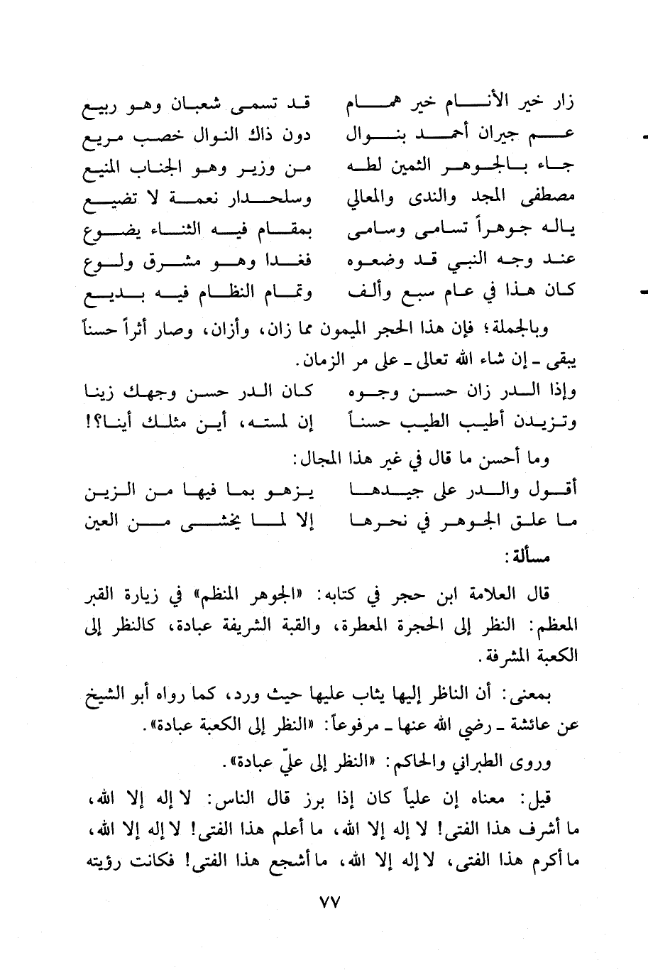... كثيراً ما تسول للإنسان نفسه محبة أهل البيت النبوي، فيعتقد صدق الدعوى، ومن ناقش في ذلك تجلت شموسه، وانحلت عروسه، وإذا طلع الصباح فلا حاجة إلى المصباح. قال بعضهم: إذا رأيت المبتلى من أهل البيت، ورأيت في نفسك الرحمة له، والرأفة به، وعزمت على مساعدته على الزمان من غير استنكاف أحواله الغير المحتملة، فذلك دليل المحبة، وأما مراعاة الشريف إذا كانت له حالة تقتضيها، وملاحة ترتضيها، فالحكم حينئذ يدور مع العلة. وقال في ذلك: