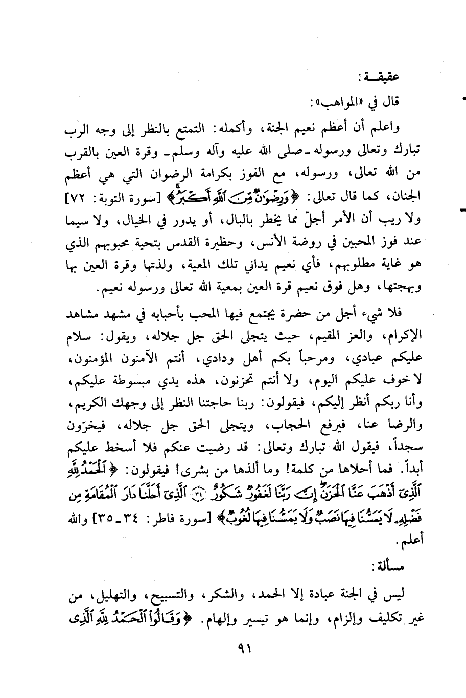 ... حتى إن من ذهب إلى أطراف المدينة من بساتينها، وحدائقها، وجد من نفسه الوحشة، وقلة الأمان، ولا تطيب بغيبته أكثر من ثلاثة أيام؛ ولذلك كره بعض العلماء كثرة الزيارة مخافة السآمة، والملل، فينبغي أن يغيب أحياناً ليجدد عهود الأشواق، ويرجع المحب المشتاق.