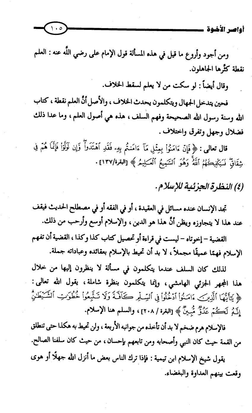 لذلك كان السلف عندما يتكلمون في مسألة لا ينظرون إليها من خلال هذا المجهر الجزئي الهامشي، وإنما يتكلمون بنظرة شاملة، يقول الله تعالى " يَا أَيُّهَا الَّذِينَ آمَنُواْ ادْخُلُواْ فِي السِّلْمِ كَآفَّةً وَلاَ تَتَّبِعُواْ خُطُوَاتِ الشَّيْطَانِ إِنَّهُ لَكُمْ عَدُوٌّ مُّبِين" [البقرة / 208]، والسلم هنا الإسلام.