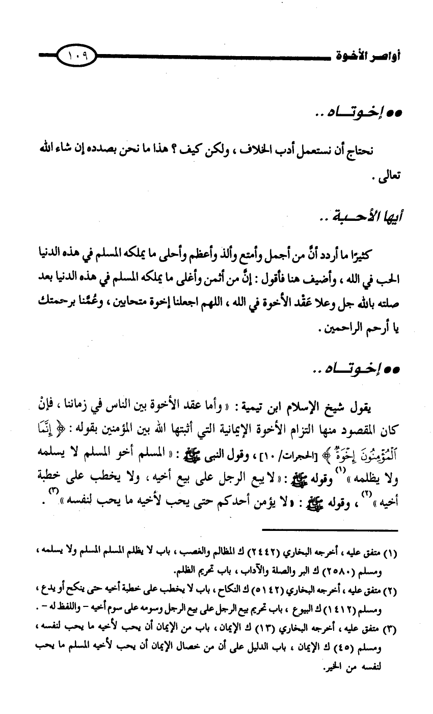 يقول شيخ الإسلام ابن تيمية: " وأما عقد الأخوة بين الناس في زماننا، فإنْ كان المقصود منها التزام الأخوة الإيمانية التي أثبتها الله بين المؤمنين بقوله: " إِنَّمَا الْمُؤْمِنُونَ إِخْوَةٌ " [الحجرات/ 10]، وقول النبي - صلى الله عليه وسلم - " المسلم أخو المسلم لا يسلمه ولا يظلمه " (¬1) وقوله - صلى الله عليه وسلم - " لا يبع الرجل على بيع أخيه، ولا يخطب على خطبة أخيه " (¬2)، وقوله - صلى الله عليه وسلم - " لا يؤمن أحدكم حتى يحب لأخيه ما يحب لنفسه " (¬3)