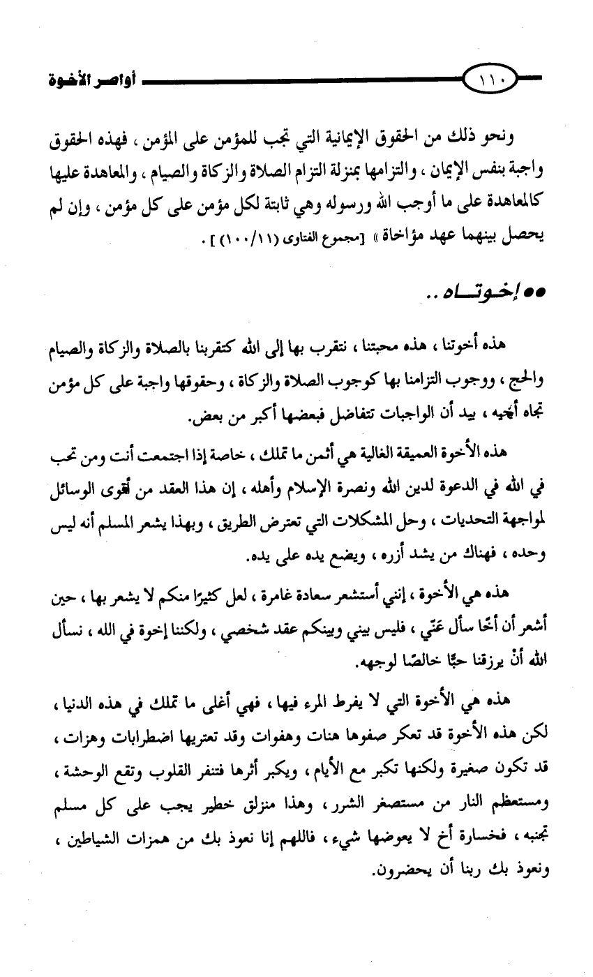 هذه أخوتنا، هذه محبتنا، نتقرب بها إلى الله كتقربنا بالصلاة والزكاة والصيام والحج، ووجوب التزامنا بها كوجوب الصلاة والزكاة، وحقوقها واجبة على كل مؤمن تجاه أخيه، بيد أن الواجبات تتفاضل فبعضها أكبر من بعض.