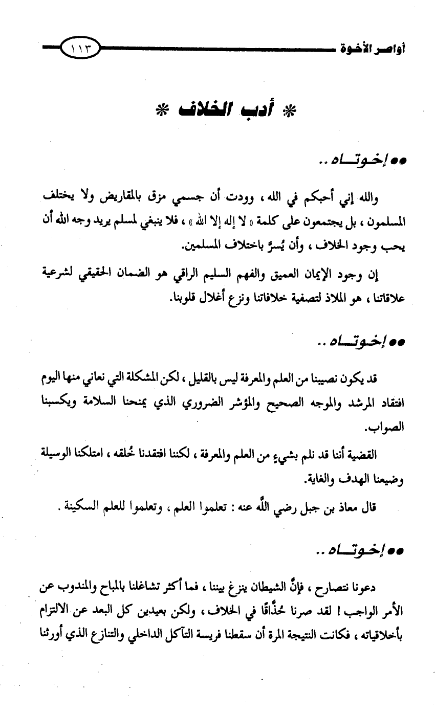 والله إني أحبكم في الله، وودت أن جسمي مزق بالمقاريض ولا يختلف المسلمون، بل يجتمعون على كلمة " لا إله إلا الله "، فلا ينبغي لمسلم يريد وجه الله أن يحب وجود الخلاف، وأن يُسرَّ باختلاف المسلمين.