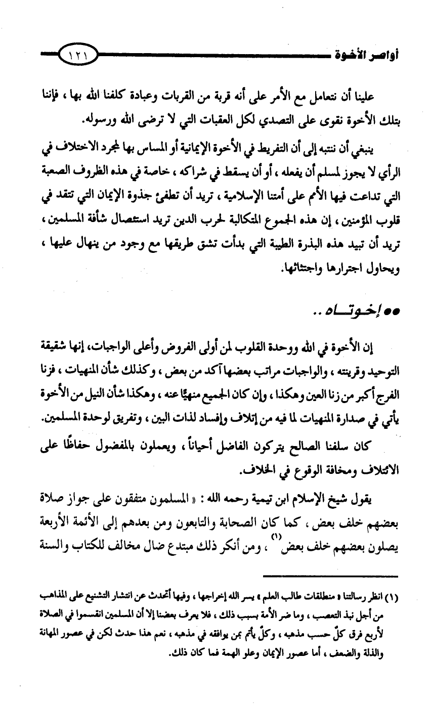 كان سلفنا الصالح يتركون الفاضل أحياناً، ويعملون بالمفضول حفاظاً على الائتلاف ومخافة الوقوع في الخلاف.