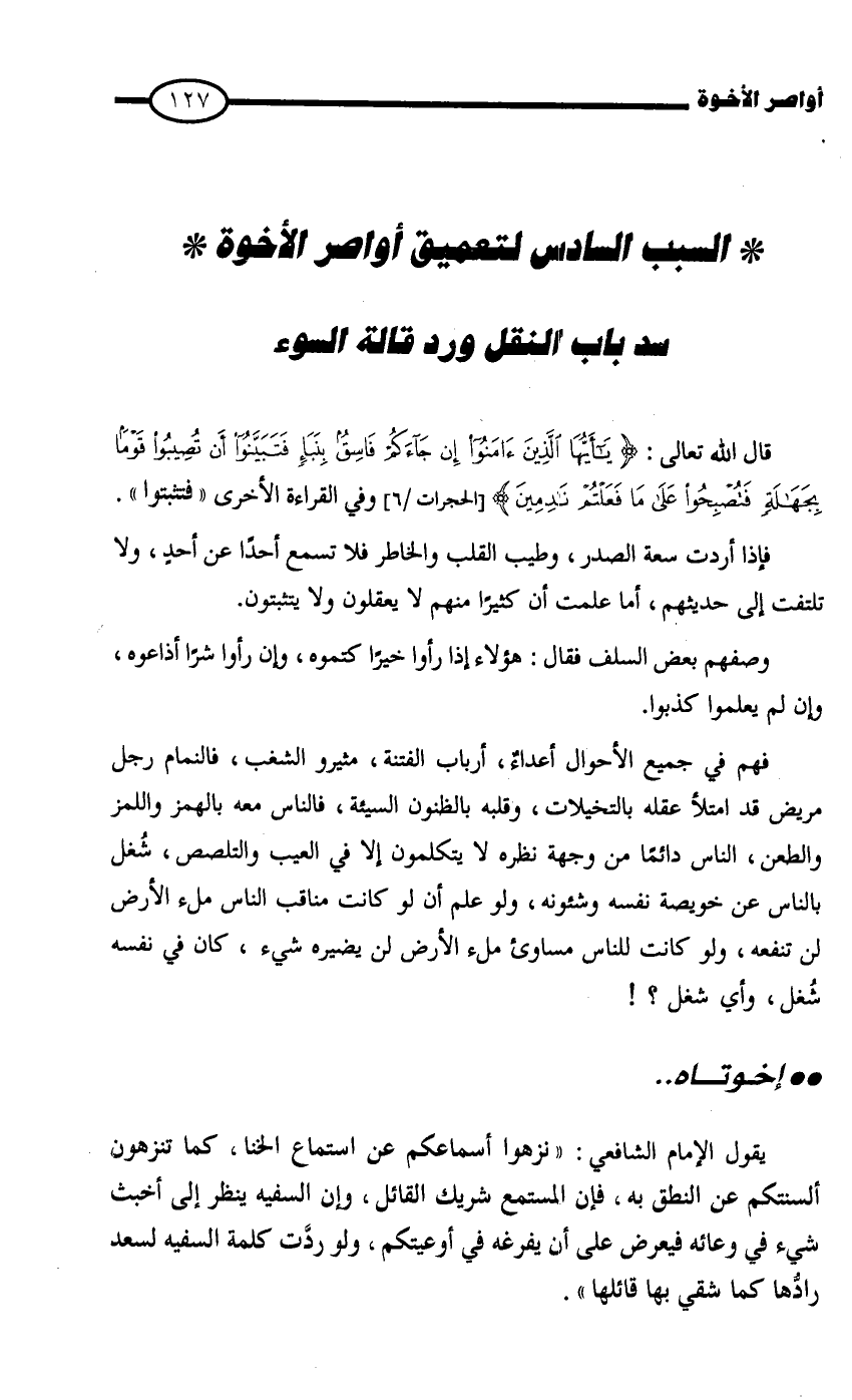 يقول الإمام الشافعي: "نزهوا أسماعكم عن استماع الخنا، كما تنزهون ألسنتكم عن النطق به، فإن المستمع شريك القائل، وإن السفيه ينظر إلى أخبث شيء في وعائه فيعرض على أن يفرغه في أوعيتكم، ولو ردَّت كلمة السفيه لسعد رادُّها كما شقي بها قائلها ".
