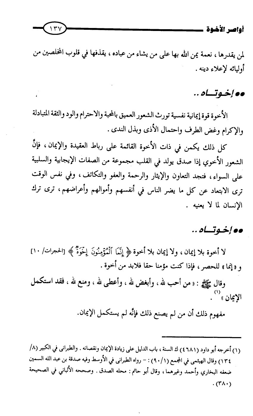 الأخوة قوة إيمانية نفسية تورث الشعور العميق بالمحبة والاحترام والود والثقة المتبادلة والإكرام وغض الطرف واحتمال الأذى وبذل الندى.