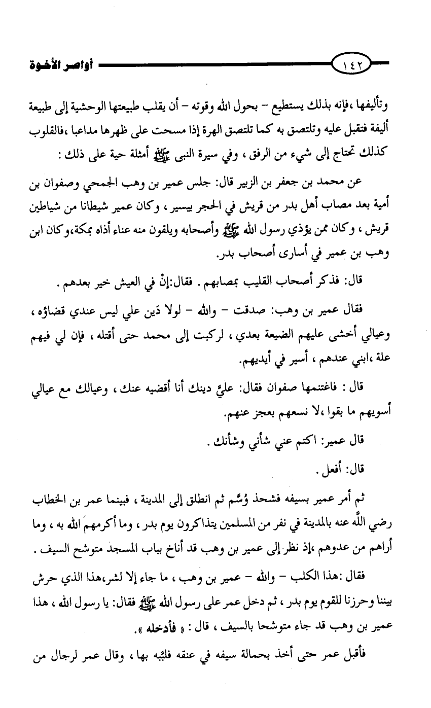 عن محمد بن جعفر بن الزبير قال: جلس عمير بن وهب الجمحي وصفوان ابن أمية بعد مصاب أهل بدر من قريش في الحجر بيسير، وكان عمير شيطانا من شياطين قريش وكان ممن يؤذي رسول الله - صلى الله عليه وسلم - وأصحابه ويلقون منه عناء أذاهم بمكة، وكان ابن وهب بن عمير في أسارى أصحاب بدر.