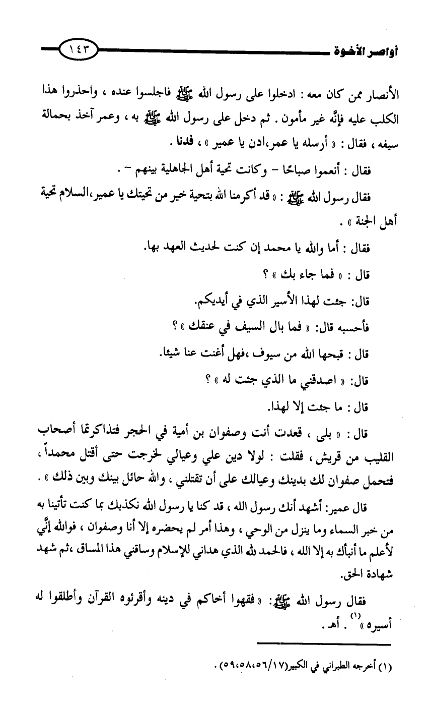 الأنصار ممن كان معه: ادخلوا على رسول الله - صلى الله عليه وسلم - فاجلسوا عنده واحذروا هذا الكلب عليه فإنَّه غير مأمون. ثم دخل على رسول الله - صلى الله عليه وسلم - به وعمر آخذ بحمالة سيفه، فقال: أرسله يا عمر، ادن يا عمير، فدنا.