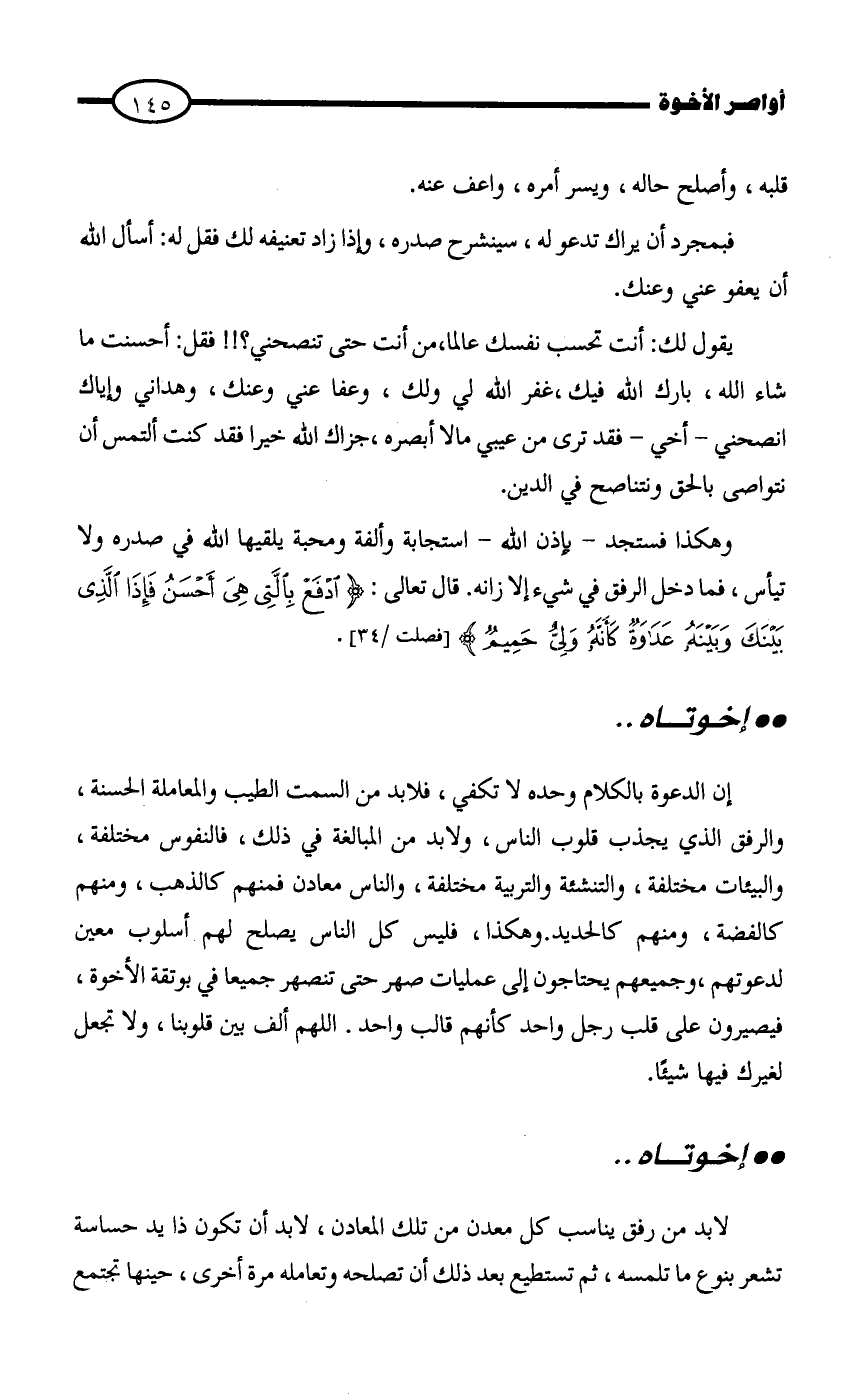 إن الدعوة بالكلام وحده لا تكفي، فلابد من السمت الطيب والمعاملة الحسنة، والرفق الذي يجذب قلوب الناس، ولابد من المبالغة في ذلك، فالنفوس مختلفة، والبيئات مختلفة، والتنشئة والتربية مختلفة، والناس معادن فمنهم كالذهب، ومنهم كالفضة، ومنهم كالحديد…وهكذا، فليس كل الناس يصلح لهم أسلوب معين لدعوتهم، وجميعهم يحتاجون إلى عمليات صهر حتى تنصهر جميعا في بوتقة الأخوة، فيصيرون على قلب رجل واحد كأنهم قالب واحد. اللهم ألف بين قلوبنا ولا تجعل لغيرك فيها شيئا.