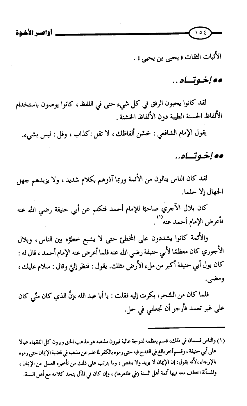 والأئمة كانوا يشددون على المخطئ حتى لا يشيع خطؤه بين الناس، وبلال الأجوري كان معظماً لأبي حنيفة - رضي الله عنه -فلما أعرض عنه الإمام أحمد، قال له: كان بول أبي حنيفة أكبر من ملء الأرض مثلك. يقول: فنظر إليَّ وقال: سلام عليك، ومضى.