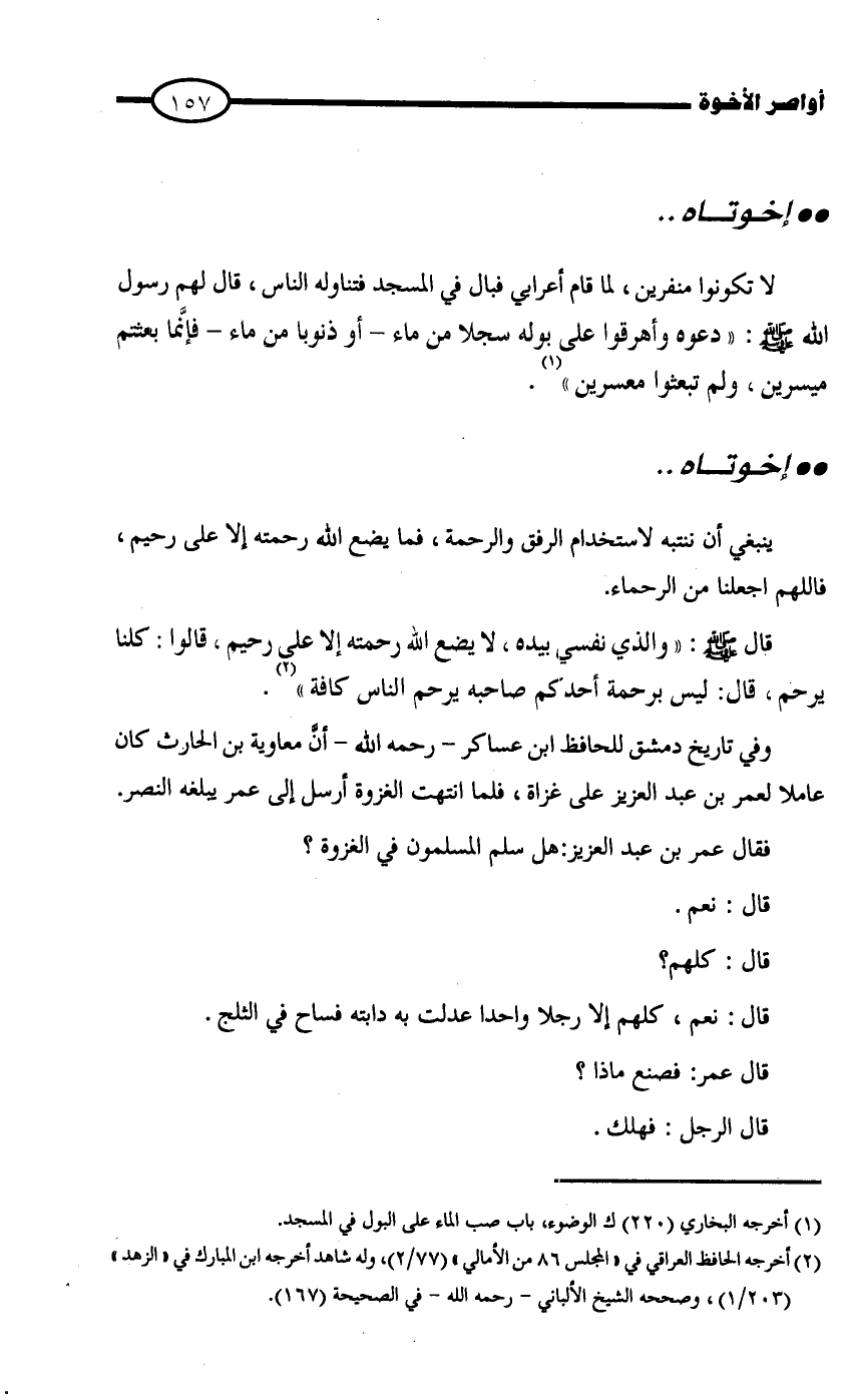 لا تكونوا منفرين، لما قام أعرابي فبال في المسجد فتناوله الناس، قال لهم رسول الله - صلى الله عليه وسلم -: " دعوه واهرقوا على بوله سجلا من ماء ـ أو ذنوبا من ماء ـ فإنَّما بعثتم ميسرين، ولم تبعثوا معسرين " (¬1)