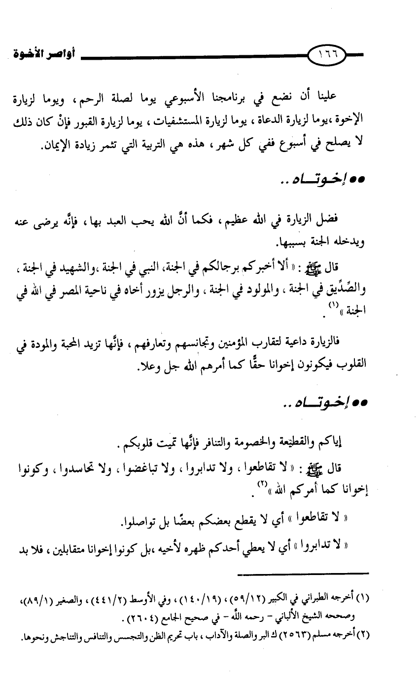 علينا أن نضع في برنامجنا الأسبوعي يوما لصلة الرحم، ويوما لزيارة الإخوة، يوما لزيارة الدعاة، يوما لزيارة المستشفيات، يوما لزيارة القبور فإنْ كان ذلك لا يصلح في أسبوع ففي كل شهر، هذه هي التربية التي تثمر زيادة الإيمان.