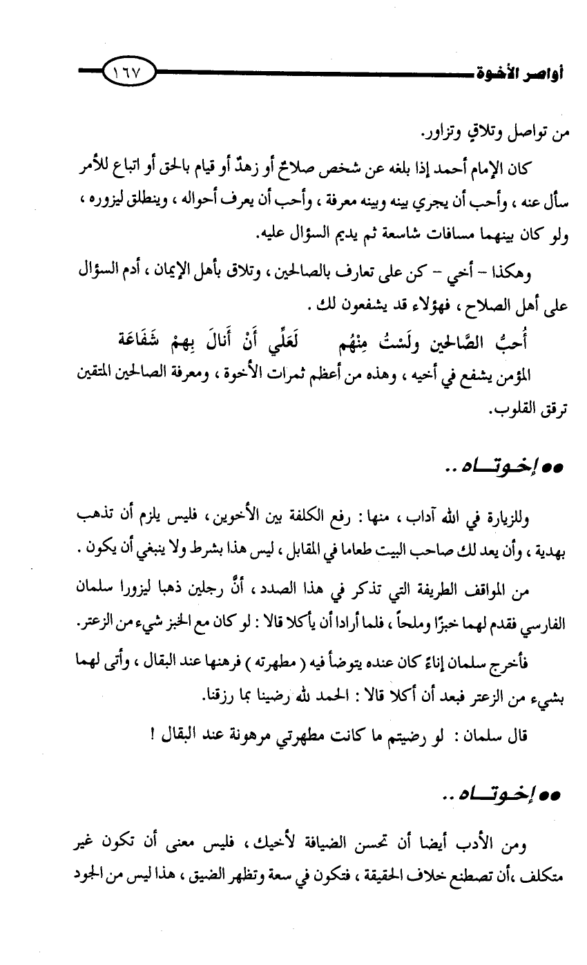 كان الإمام أحمد إذا بلغه عن شخص صلاحاً أو زهداً أو قياماً بالحق أو اتباعاً للأمر سأل عنه، وأحب أن يجري بينه وبينه معرفة، وأحب أن يعرف أحواله، وينطلق ليزوره، ولو بينهما مسافات شاسعة ثم يديم السؤال عليه.
