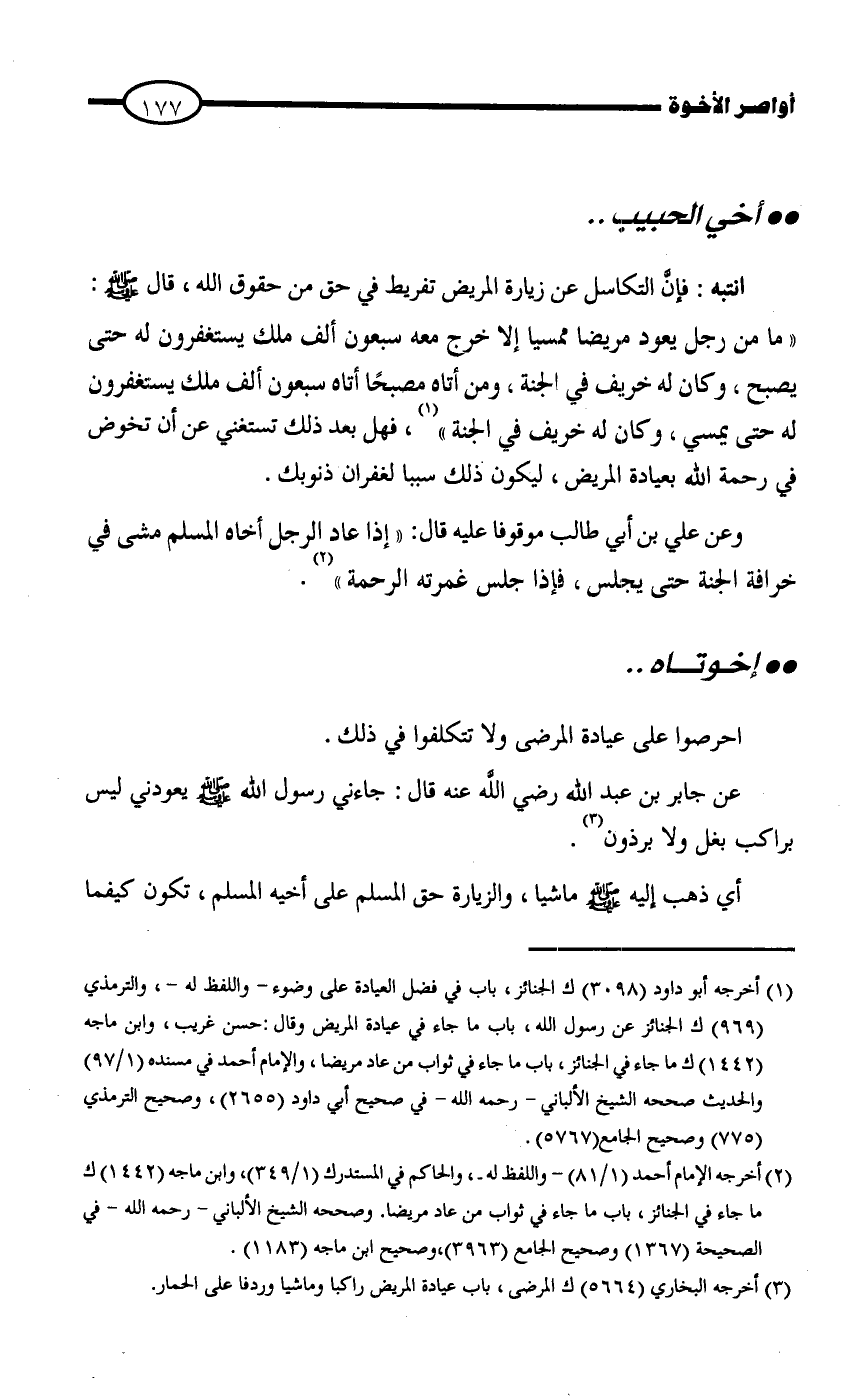 (¬1) أخرجه أبو داود (3098) ك الجنائز، باب في فضل العيادة على وضوء ـ واللفظ له ـ، والترمذي (969) ك الجنائز عن رسول الله، باب ما جاء في عيادة المريض وقال: حسن غريب، وابن ماجه (1442) ك ما جاء في الجنائز، باب ما جاء في ثواب من عاد مريضا، والإمام أحمد في مسنده (1/ 97) والحديث صححه الشيخ الألباني ـ رحمه الله ـ في صحيح أبي داود (2655)، وصحيح الترمذي (775) وصحيح الجامع (5767).