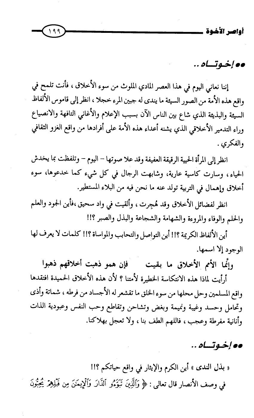إننا نعاني اليوم في هذا العصر المادي الملوث من سوء الأخلاق، فأنت تلمح في واقع هذه الأمة من الصور السيئة ما يندى له جبين المرء خجلا، انظر إلى قاموس الألفاظ السيئة والبذيئة الذي شاع بين الناس الآن بسبب الإعلام والأغاني التافهة والانصياع وراء التدمير الأخلاقي الذي يشنه أعداء هذه الأمة على أفرادها من واقع الغزو الثقافي والفكري.