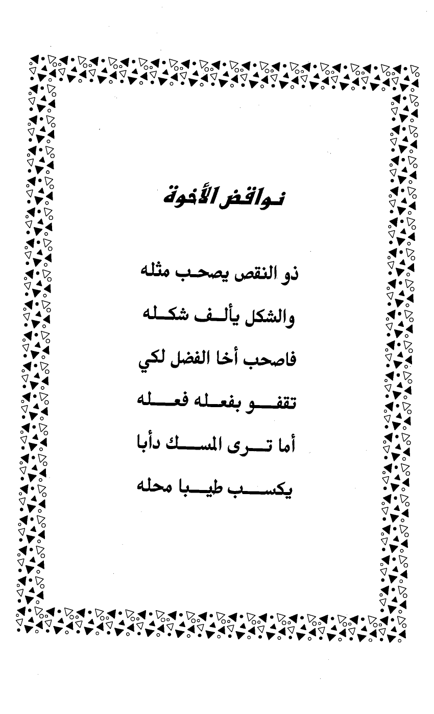 ذو النقص يصحب مثله والشكل يألف شكله فاصحب أخا الفضل لكي تقفو بفعله فعله أما ترى المسك دأبا يكسب طيبا محله