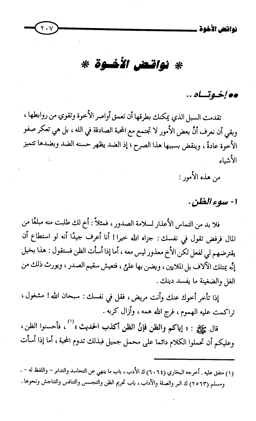 تقدمت السبل الذي يمكنك بطرقها أن تعمق أواصر الأخوة وتقوي من روابطها، وبقي أن نعرف أنَّ بعض الأمور لا تجتمع مع المحبة الصادقة في الله، بل هي تعكر صفو الأخوة عادةً، وينقض بسببها هذا الصرح. إذ الضد يظهر حسنه الضد وبضدها تتميز الأشياء