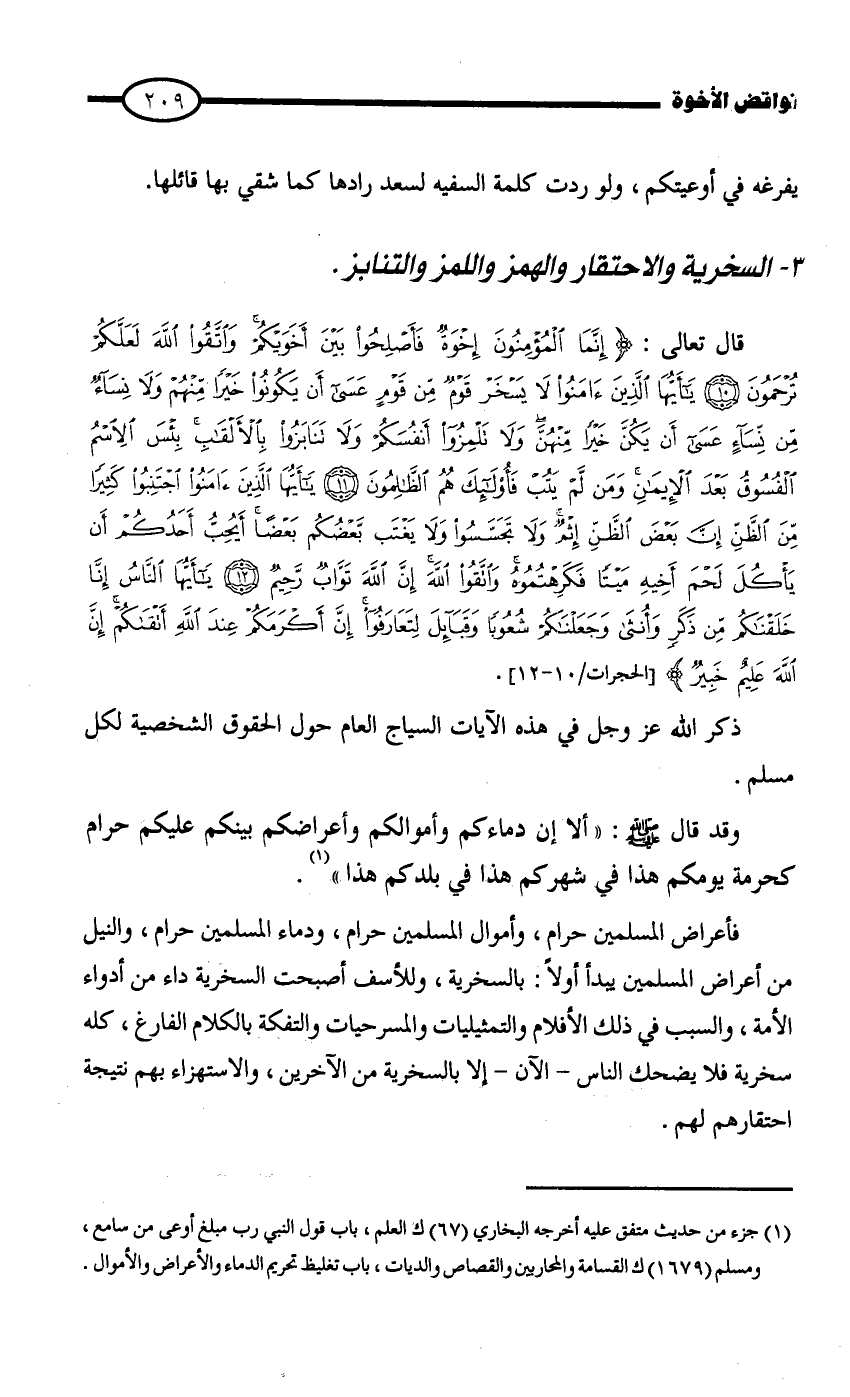 فأعراض المسلمين حرام، وأموال المسلمين حرام، ودماء المسلمين حرام، والنيل من أعراض المسلمين يبدأ أولاً: بالسخرية، وللأسف أصبحت السخرية داء من أدواء الأمة، والسبب في ذلك الأفلام والتمثيليات والمسرحيات والتفكة بالكلام الفارغ، كله سخرية فلا يضحك الناس ـ الآن ـ إلا بالسخرية من الآخرين، والاستهزاء بهم نتيجة احتقارهم لهم.