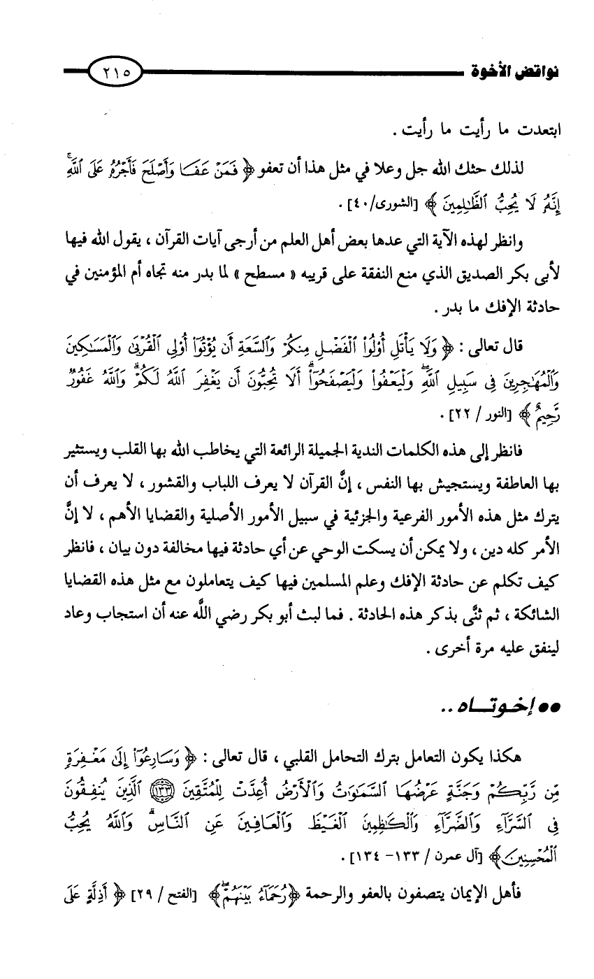 فانظر إلى هذه الكلمات الندية الجميلة الرائعة التي يخاطب الله بها القلب ويستثير بها العاطفة ويستجيش بها النفس، إنَّ القرآن لا يعرف اللباب والقشور، لا يعرف أن يترك مثل هذه الأمور الفرعية والجزئية في سبيل الأمور الأصلية والقضايا الأهم، لا إنَّ الأمر كله دين، ولا يمكن أن يسكت الوحي عن أي حادثة فيها مخالفة دون بيان، فانظر كيف تكلم عن حادثة الإفك وعلم المسلمين فيها كيف يتعاملون مع مثل هذه القضايا الشائكة، ثم ثنَّى بذكر هذه الحادثة. فما لبث أبو بكر - رضي الله عنه - أن استجاب وعاد لينفق عليه مرة أخرى.