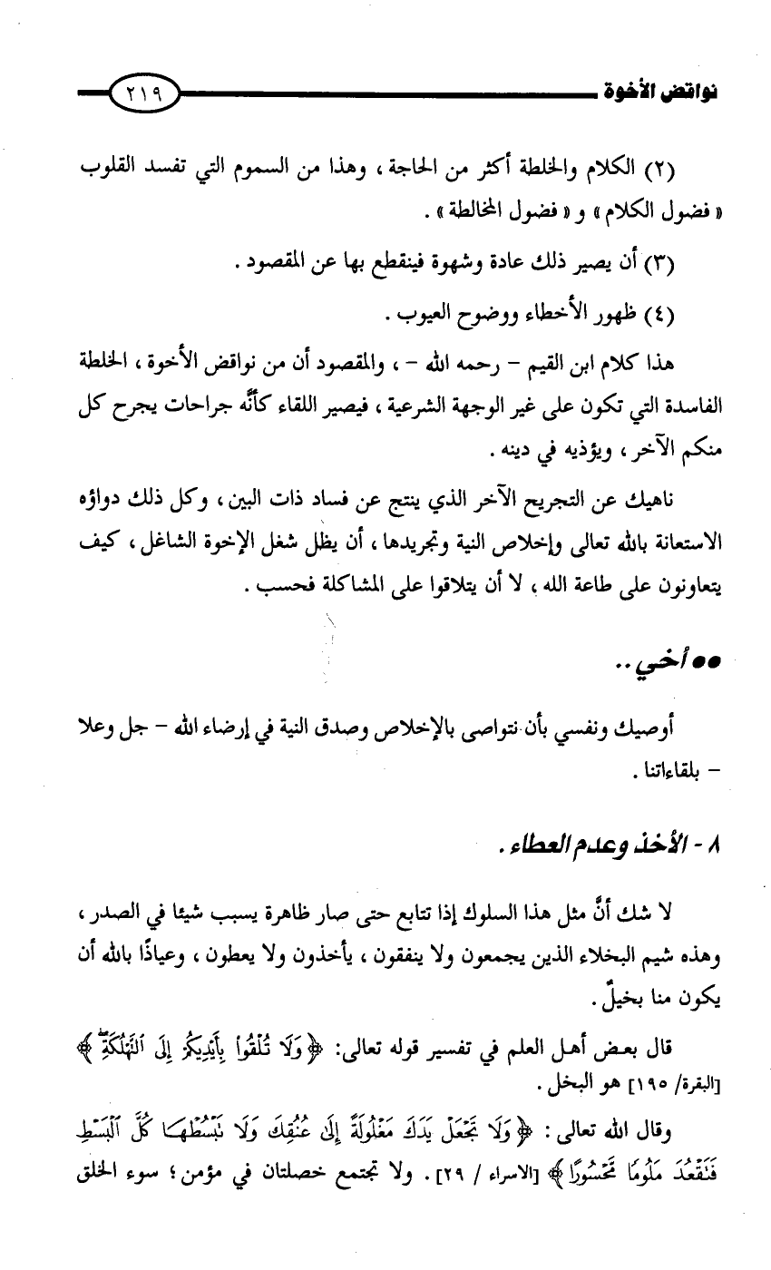 هذا كلام ابن القيم ـ رحمه الله ـ، والمقصود أن من نواقض الأخوة الخلطة الفاسدة التي تكون على غير الوجهة الشرعية، فيصير اللقاء كأنَّه جراحات يجرح كل منكم الآخر ويؤذيه في دينه.