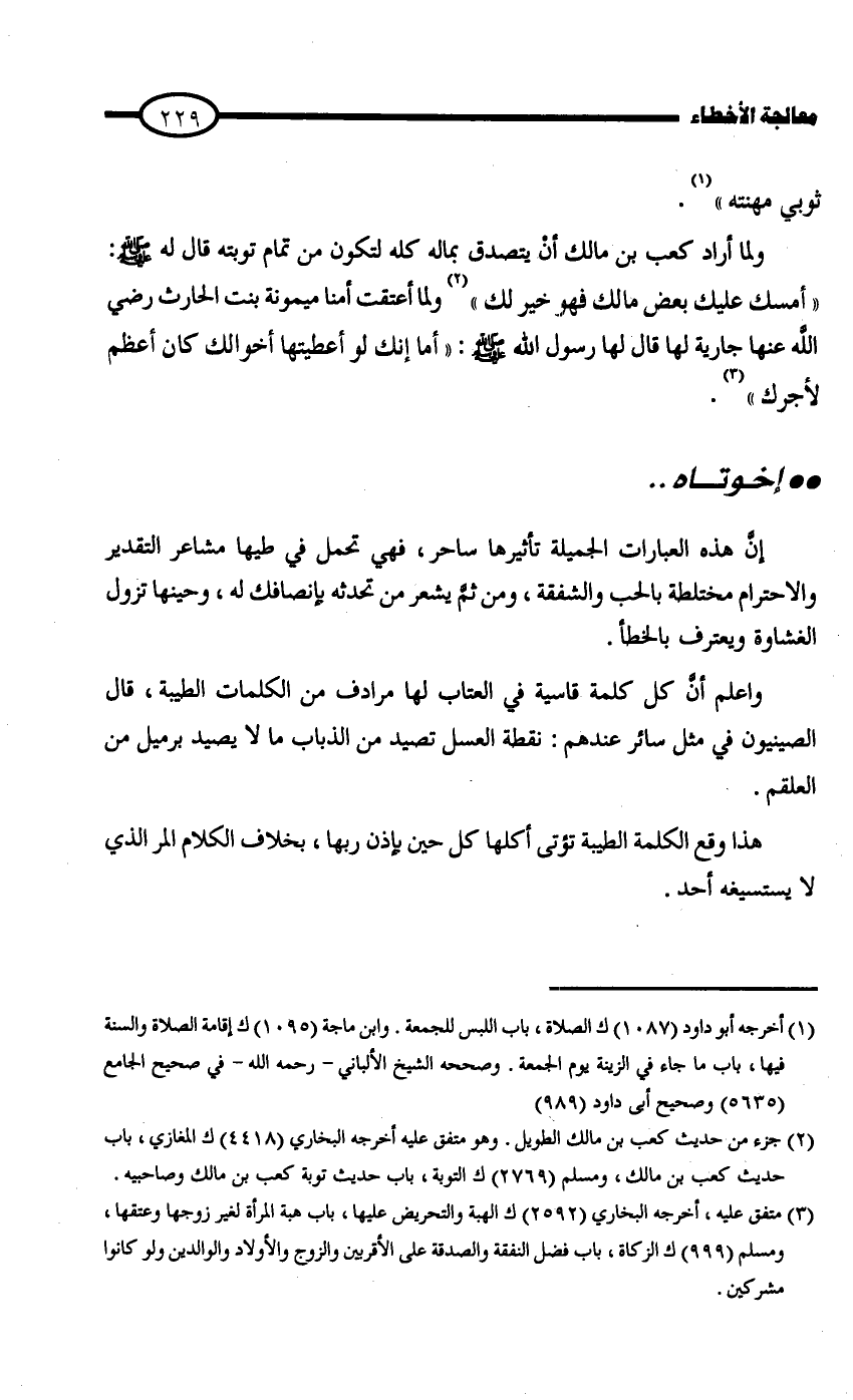 ولما أراد كعب بن مالك أنْ يتصدق بماله كله لتكون من تمام توبته قال له - صلى الله عليه وسلم -: " أمسك عليك بعض مالك فهو خير لك " (¬2) ولما أعتقت أمنا ميمونة بن الحارث - رضي الله عنه - جارية لها قال لها رسول الله - صلى الله عليه وسلم -: ـ " أما إنك لو أعطيتها أخوالك كان أعظم لأجرك ". (¬3)