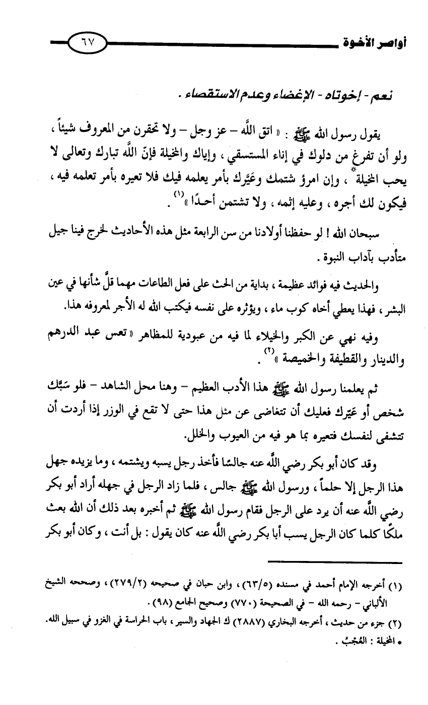 يقول رسول الله - صلى الله عليه وسلم - " اتق الله - عز وجل - ولا تحقرن من المعروف شيئاً، ولو أن تفرغ من دلوك في إناء المستسقي، وإياك والمخيلة فإنَّ الله تبارك وتعالى لا يحب المخيلة، وإنْ امرؤ شتمك وعَيَّرك بأمر يعلمه فيك فلا تعيره بأمر تعلمه فيه، فيكون لك أجره، وعليه إثمه، ولا تشتمن أحداً " (¬1)