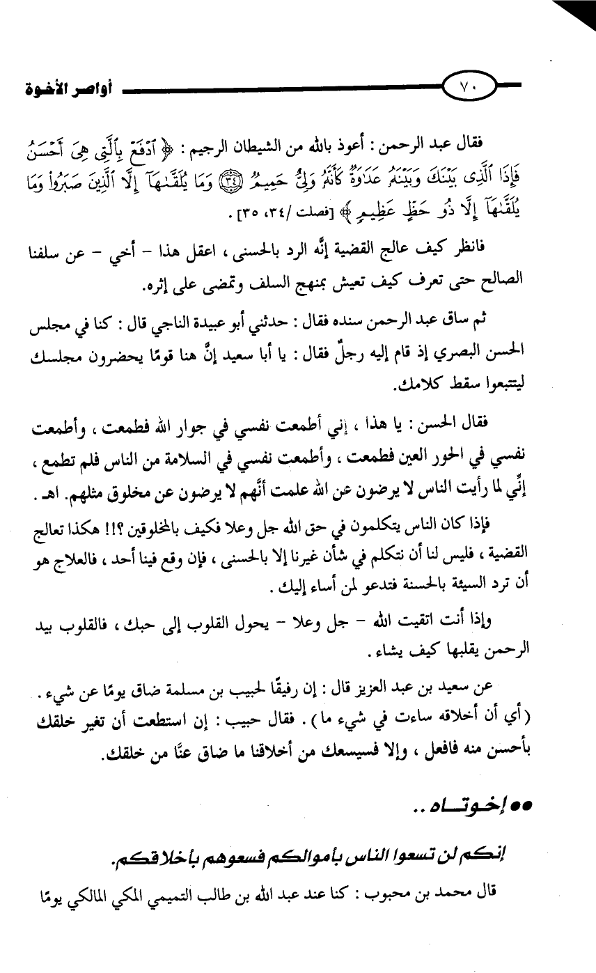 فقال عبد الرحمن: أعوذ بالله من الشيطان الرجيم، " ادْفَعْ بِالَّتِي هِيَ أَحْسَنُ فَإِذَا الَّذِي بَيْنَكَ وَبَيْنَهُ عَدَاوَةٌ كَأَنَّهُ وَلِيٌّ حَمِيمٌ وَمَا يُلَقَّاهَا إِلَّا الَّذِينَ صَبَرُوا وَمَا يُلَقَّاهَا إِلَّا ذُو حَظٍّ عَظِيمٍ " [فصلت /34ـ35]