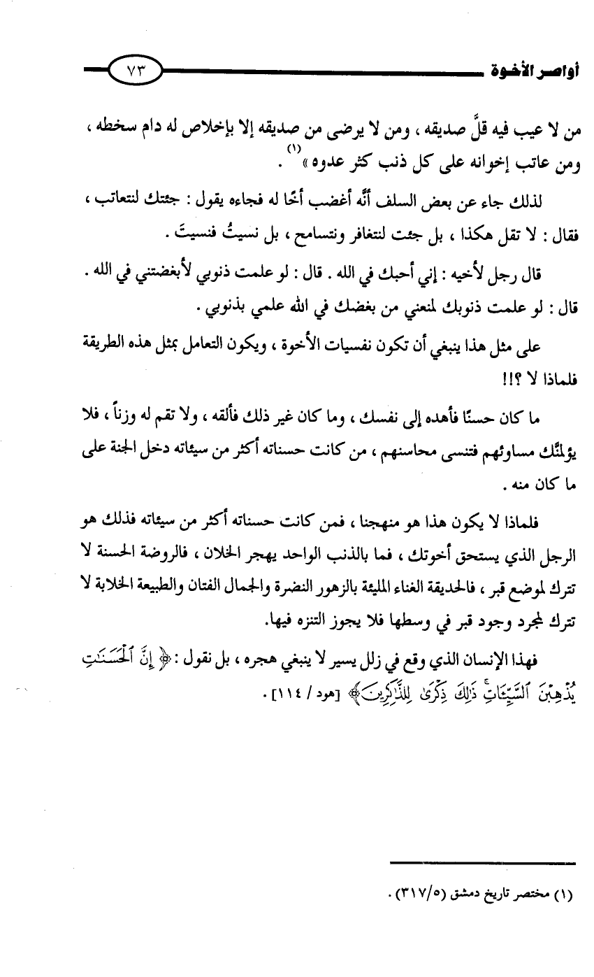 فلماذا لا يكون هذا هو منهجنا، فمن كانت حسناته أكثر من سيئاته فذلك هو الرجل الذي يستحق أخوتك، فما بالذنب الواحد يهجر الخلان، فالروضة الحسنة لا تترك لموضع قبر، فالحديقة الغناء المليئة بالزهور النضرة والجمال الفتان والطبيعة الخلابة لا تترك لمجرد وجود قبر في وسطها فلا يجوز التنزه فيها.