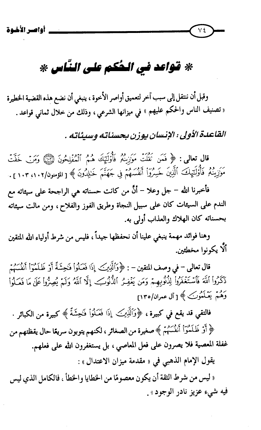 وقبل أن ننتقل إلى سبب آخر لتعميق أواصر الأخوة، ينبغي أن نضع هذه القضية الخطيرة " تصنيف الناس والحكم عليهم " في ميزانها الشرعي، وذلك من خلال ثماني قواعد.