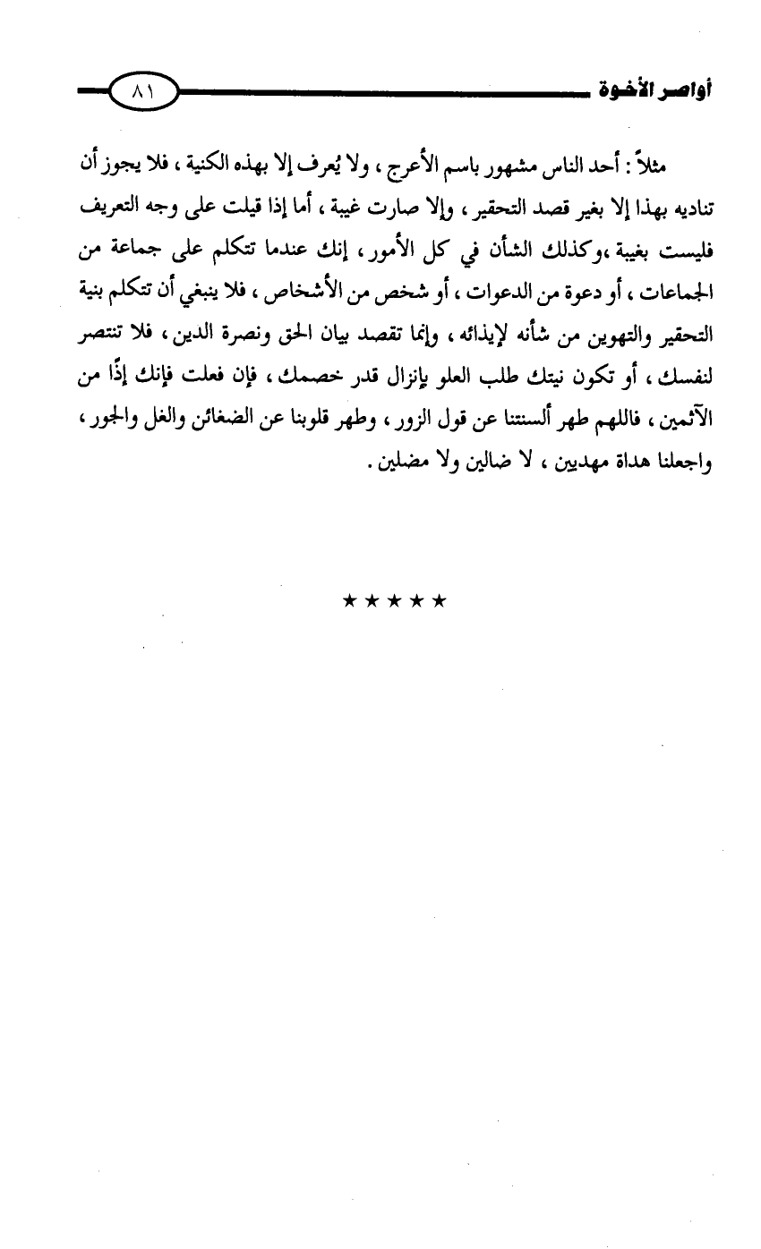 مثلاً: أحد الناس مشهور باسم الأعرج - مثلاً - ولا يُعرف إلا بهذه الكنية، فلا يجوز أن تناديه بهذا إلا بغير قصد التحقير، وإلا صارت غيبة، أما إذا قيلت على وجه التعريف فليست بغيبة، وكذلك الشأن في كل الأمور، إنك عندما تتكلم على جماعة من الجماعات، أو دعوة من الدعوات، أو شخص من الأشخاص فلا ينبغي أن تتكلم بنية التحقير والتهوين من شأنه لإيذائه، وإنما تقصد بيان الحق ونصرة الدين، فلا تنتصر لنفسك، أو تكون نيتك طلب العلو بإنزال قدر خصمك، فإن فعلت فإنك إذاً من الآثمين، فاللهم طهر ألسنتنا عن قول الزور، وطهر قلوبنا عن الضغائن والغل والجور، واجعلنا هداة مهديين لا ضالين ولا مضلين.