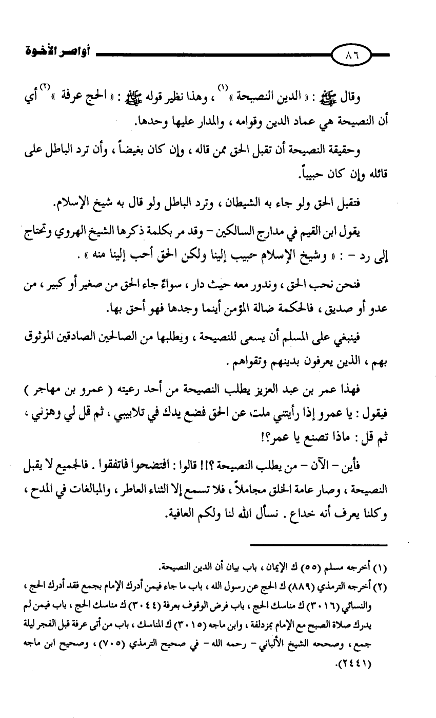 وقال - صلى الله عليه وسلم - " الدين النصيحة " (¬1)، وهذا نظير قوله - صلى الله عليه وسلم - "الحج عرفة " (¬2) أي أن النصيحة هي عماد الدين وقوامه، والمدار عليها وحدها.