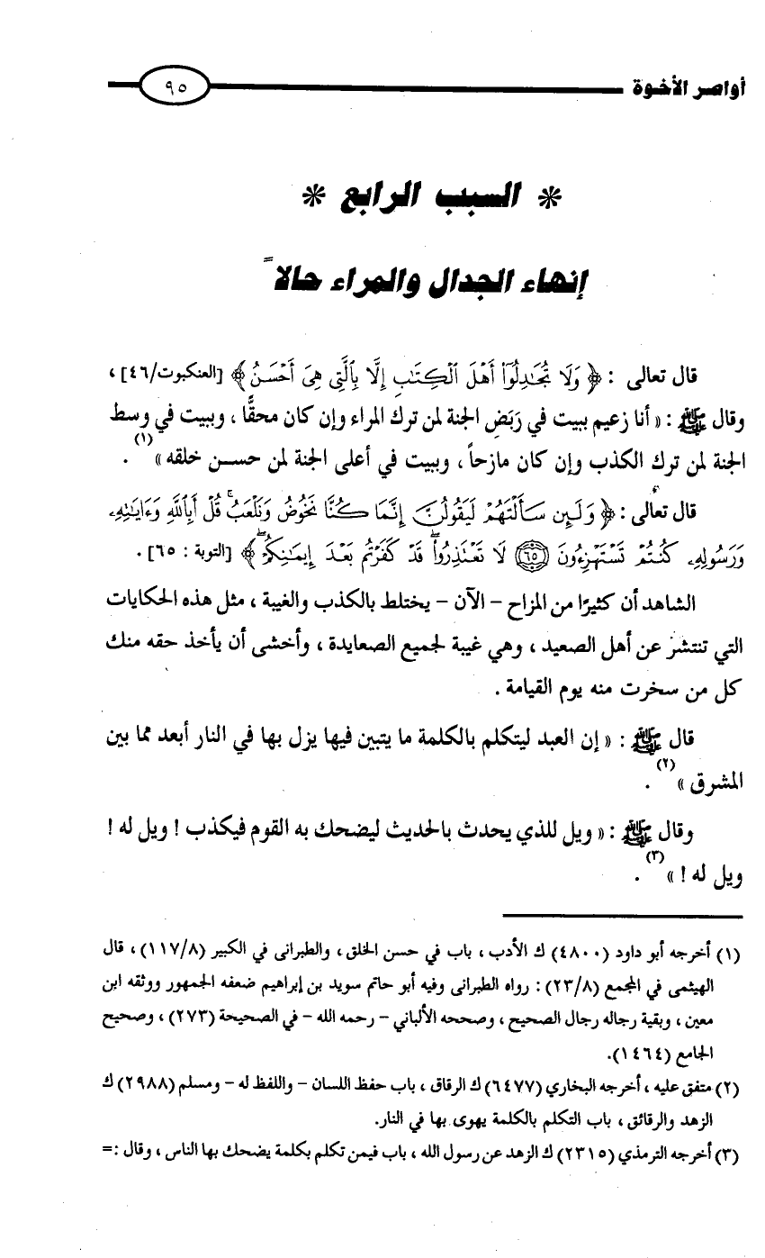 قال تعالى " وَلَا تُجَادِلُوا أَهْلَ الْكِتَابِ إِلَّا بِالَّتِي هِيَ أَحْسَن " [العنكبوت/46] وقال - صلى الله عليه وسلم -: " أنا زعيم ببيت في ربض الجنة لمن ترك المراء وإن كان محقاً، وببيت في وسط الجنة لمن ترك الكذب وإن كان مازحاً، وببيت في أعلى الجنة لمن حسن خلقه " (¬1)