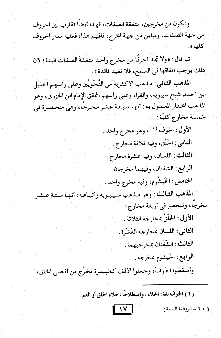 المذهب الثاني: مذهب الأكثرية من النَّحْوِيِّين وعلى رأسهم الخليل بن أحمد شيخ سيبويه، والقرّاء وعلى رأسهم المحقق الإمام ابن الجزري، وهو المذهب المختار المعمول به: أنها سبعة عشر مخرجًا، وهي منحصرة في خمسة مخارج كلية: