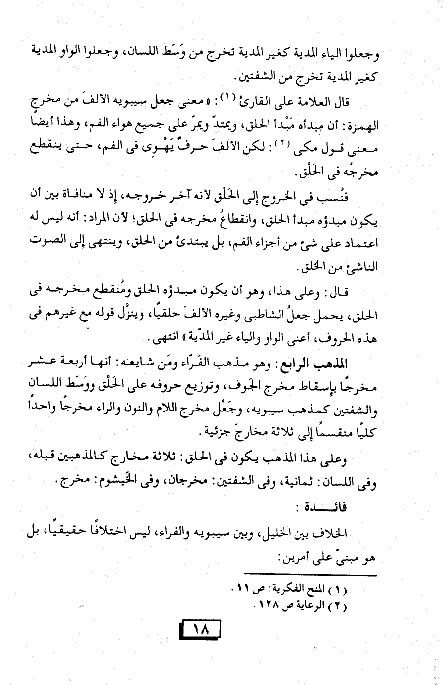 المذهب الرابع: وهو مذهب الفَرّاء ومن شايعه: أنها أربعة عشر مخرجًا بإسقاط مخرج الجوف، وتوزيع حروفه على الحلق ووسط اللسان والشفتين كمذهب سيبويه، وجعل مخرج اللام والنون والراء مخرجًا واحدًا كليًا منقسمًا إلى ثلاثة مخارج جزئية.