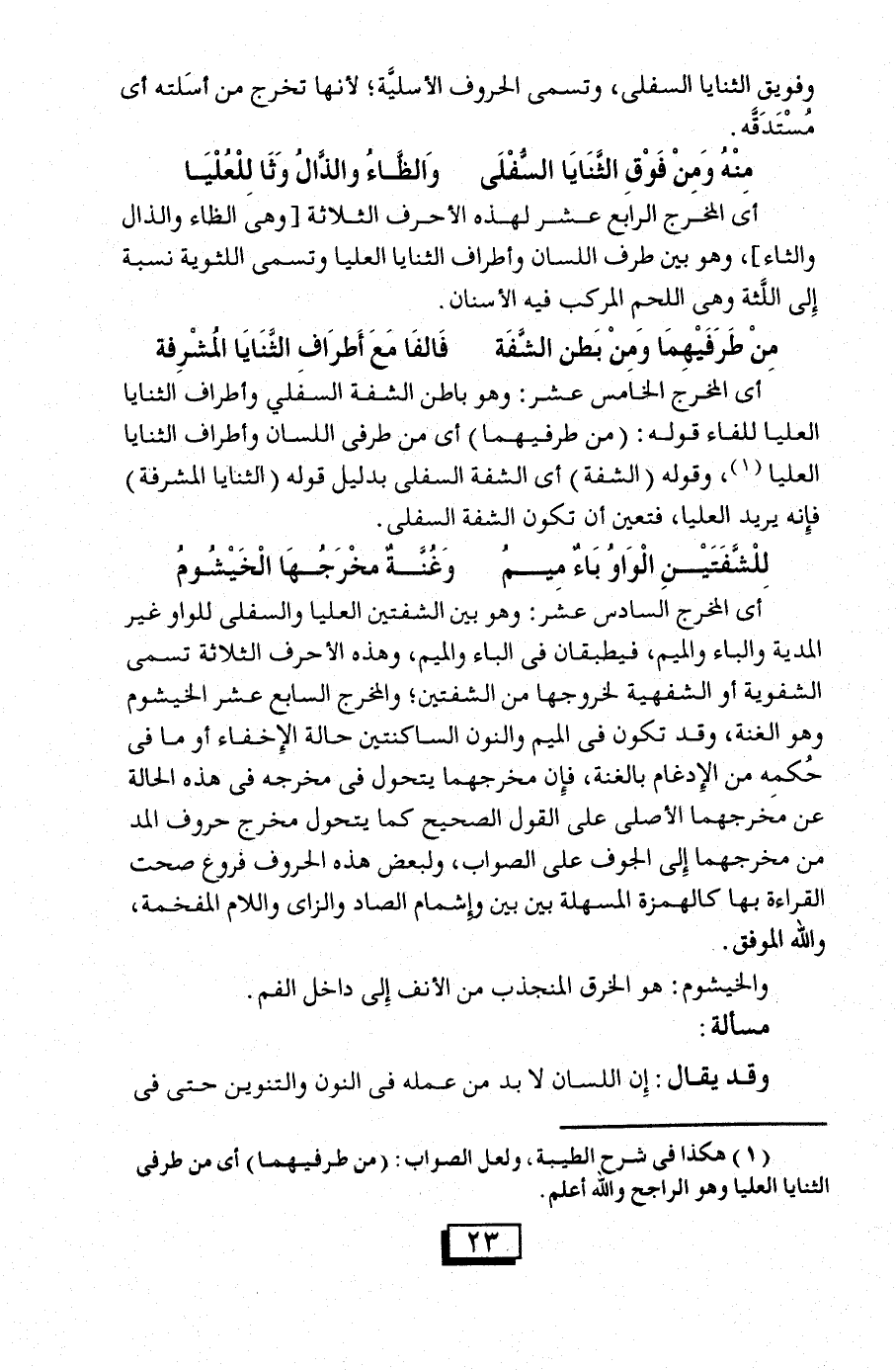 (¬1) هكذا في شرح الطيبة، ولعل الصواب: (من طرفيهما) أي من طرفي الثنايا العليا. والله أعلم.