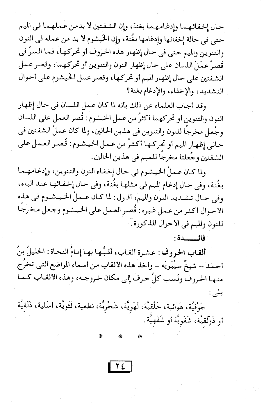 ولما كان عملُ الخيشوم في حال إخفاء النون والتنوين، وإدغامهما بغُنة، وفي حال إدغام الميم في مثلها بغُنة، وفي حال إخفائها عند الباء، وفي حال تشديد النون والميم، أقول: لما كان عملُ الخيشوم في هذه الأحوال أكثر من عمل غيره، قُصر العمل على الخيشوم وجعل مخرجًا للنون والميم في الأحوال المذكورة.