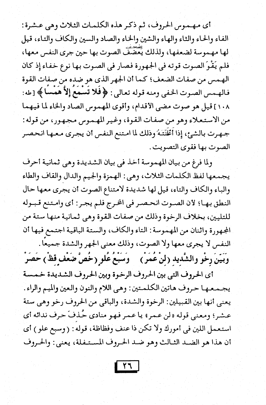 أي مهموس الحروف، ثم ذكر هذه الكلمات الثلاث وهي عشرة: الفاء، والحاء والثاء والهاء والشين والخاء والصاد والسين والكاف والتاء، قيل لها مهموسة لضعفها، ولذلك يضعف الصوت بها حين جرى النفس معها، فلم يَقْوَ الصوت قوته في الجهورة فصار في الصوت بها نوع خفاء إذ كان الهمس من صفات الضعف؛ كما أن الجهر الذي هو ضده من صفات القوة فالهمس الصوت الخفي، ومنه قوله تعالى: {فَلا تَسْمَعُ إِلا هَمْساً} [طه: 108]، قيل: هو صوت مشي الأقدام، وأقوى المهموس الصاد والخاء لها فيهما من الاستعلاء وهو من صفات القوة، وغير المهموس مجهور، من قوله: جهرت بالشيء، إذا أعلنته وذلك لما امتنع النفس أن يجري معها انحصر الصوت بها فقوي التصويت.