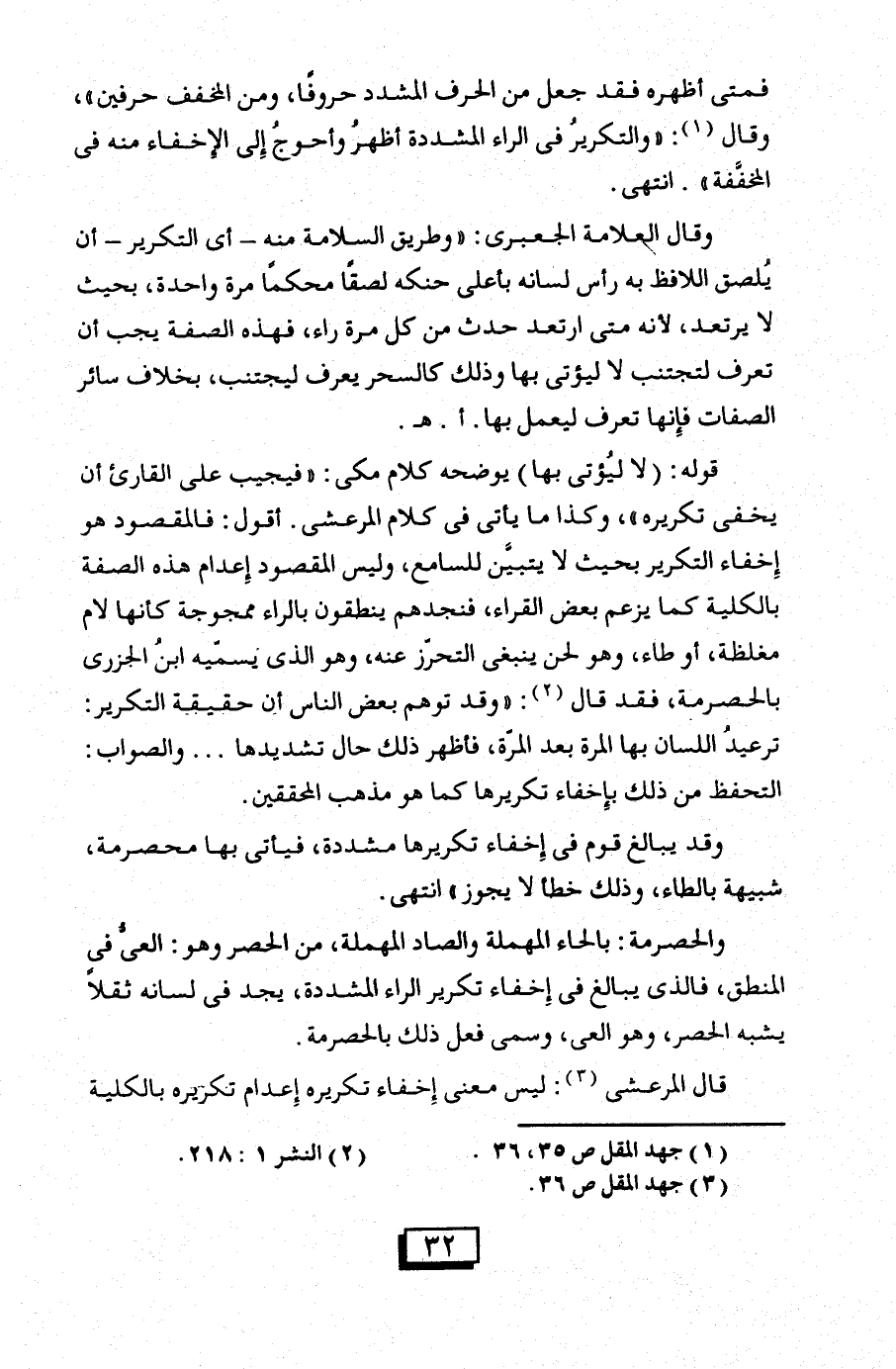 أقول: فالمقصود هو إخفاء التكرير بحيث لا يتبين للسامع، وليس المقصود إعدام هذه الصفة بالكلية كما يزعم بعض القراء، فتجدهم ينطقون بالراء ممجوجة كأنها لام مغلظة، أو طاء، وهو لحن ينبغي التحرّز عنه، وهو الذي يسميه ابن الجزري بالحصرمة، فقد قال (¬2): "وقد توهم بعض الناس أن حقيقة التكرير: ترعيد اللسان بها المرة بعد المرة، فأظهر ذلك حال تشديدها ... والصواب: التحفظ من ذلك بإخفاء تكريرها كما هو مذهب المحققين.