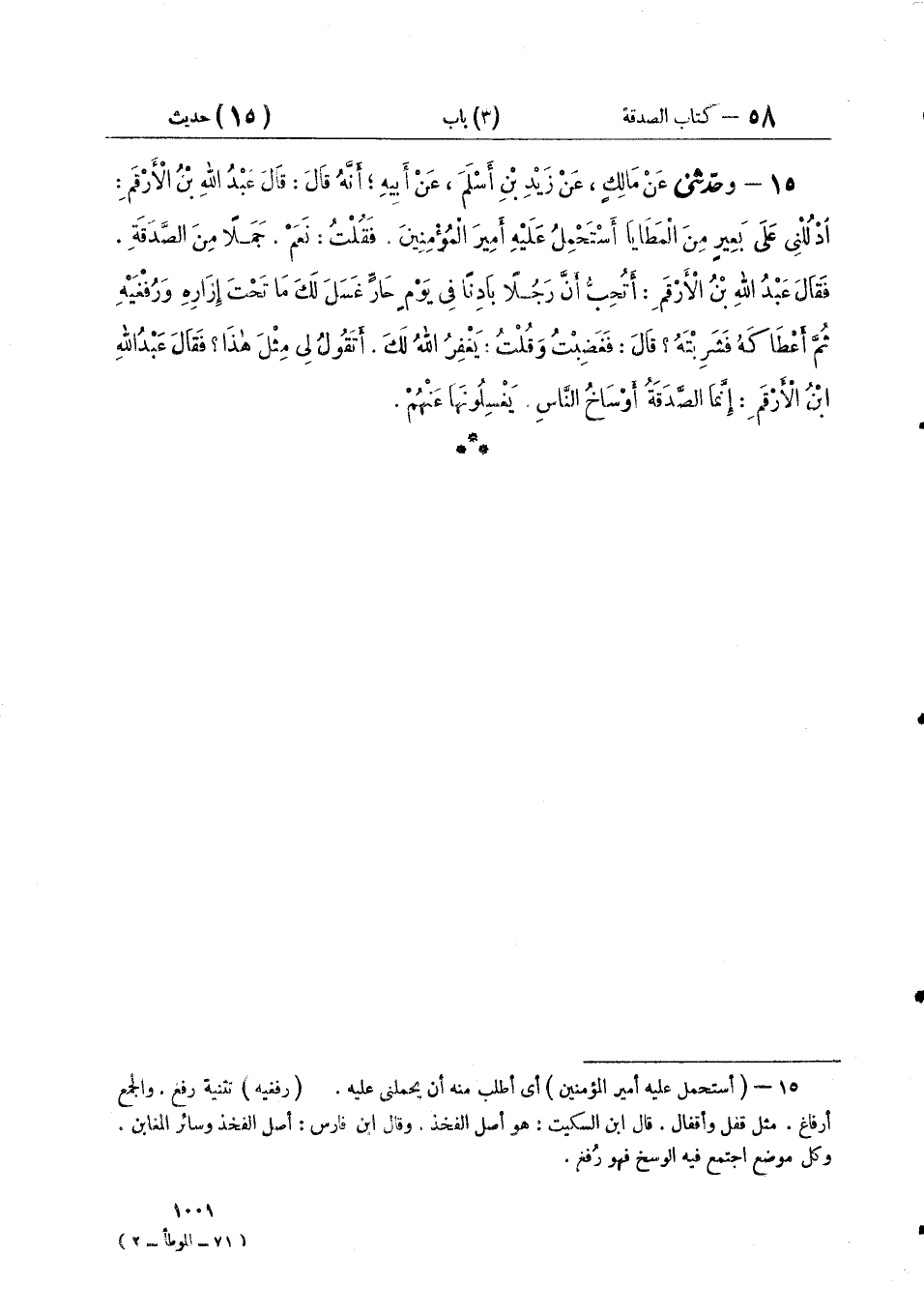 ١٥ - وَحَدَّثَنِي عَنْ مَالِكٍ، عَنْ زَيْدِ بْنِ أَسْلَمَ، عَنْ أَبِيهِ، أَنَّهُ قَالَ: قَالَ عَبْدُ اللَّهِ بْنُ الْأَرْقَمِ: «ادْلُلْنِي عَلَى بَعِيرٍ مِنَ الْمَطَايَا أَسْتَحْمِلُ عَلَيْهِ أَمِيرَ الْمُؤْمِنِينَ»، فَقُلْتُ: نَعَمْ جَمَلًا مِنَ الصَّدَقَةِ، فَقَالَ عَبْدُ اللَّهِ بْنُ الْأَرْقَمِ: «أَتُحِبُّ أَنَّ رَجُلًا بَادِنًا فِي يَوْمٍ حَارٍّ غَسَلَ لَكَ مَا تَحْتَ إِزَارِهِ وَرُفْغَيْهِ، ثُمَّ أَعْطَاكَهُ فَشَرِبْتَهُ» قَالَ: فَغَضِبْتُ، وَقُلْتُ: يَغْفِرُ اللَّهُ لَكَ، أَتَقُولُ لِي مِثْلَ هَذَا؟ فَقَالَ عَبْدُ اللَّهِ بْنُ الْأَرْقَمِ: «إِنَّمَا الصَّدَقَةُ أَوْسَاخُ النَّاسِ يَغْسِلُونَهَا عَنْهُمْ»