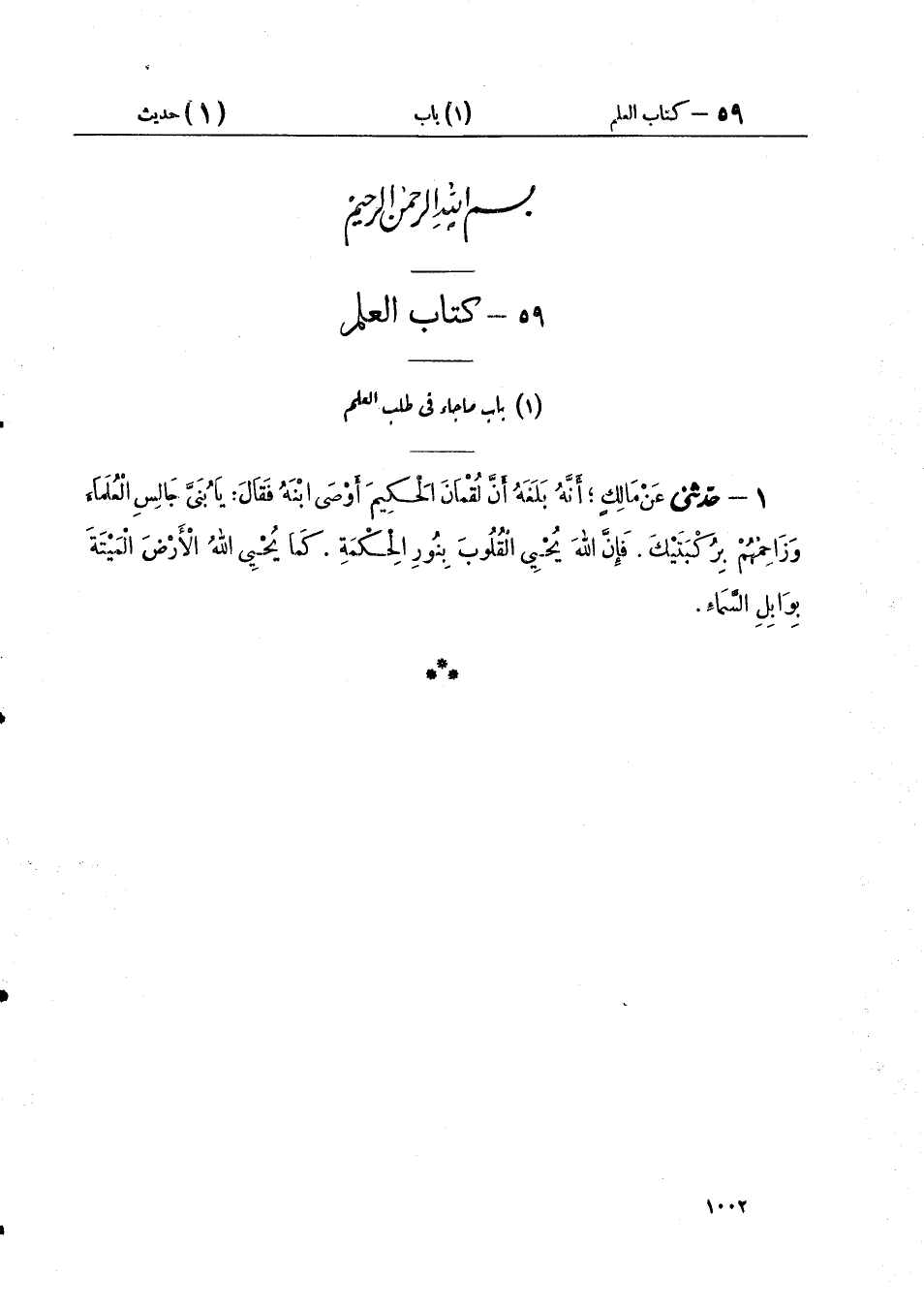١ - حَدَّثَنِي عَنْ مَالِكٍ أَنَّهُ بَلَغَهُ " أَنَّ لُقْمَانَ الْحَكِيمَ أَوْصَى ابْنَهُ فَقَالَ: يَا بُنَيَّ جَالِسِ الْعُلَمَاءَ، وَزَاحِمْهُمْ بِرُكْبَتَيْكَ، فَإِنَّ اللَّهَ يُحْيِي الْقُلُوبَ بِنُورِ الْحِكْمَةِ، كَمَا يُحْيِي اللَّهُ الْأَرْضَ الْمَيْتَةَ بِوَابِلِ السَّمَاءِ "