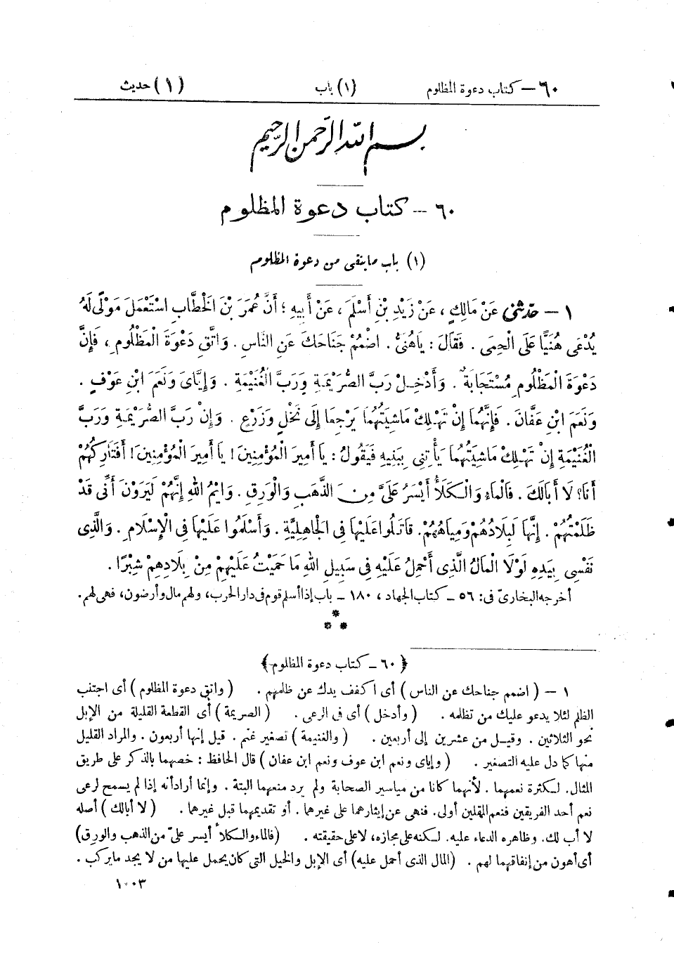 ١ - حَدَّثَنِي عَنْ مَالِكٍ، عَنْ زَيْدِ بْنِ أَسْلَمَ، عَنْ أَبِيهِ، أَنَّ عُمَرَ بْنَ الْخَطَّابِ اسْتَعْمَلَ مَوْلًى لَهُ يُدْعَى هُنَيًّا عَلَى الْحِمَى، فَقَالَ: " يَا هُنَيُّ، اضْمُمْ جَنَاحَكَ عَنِ النَّاسِ، وَاتَّقِ دَعْوَةَ الْمَظْلُومِ، فَإِنَّ دَعْوَةَ الْمَظْلُومِ مُسْتَجَابَةٌ، وَأَدْخِلْ رَبَّ الصُّرَيْمَةِ، وَرَبَّ الْغُنَيْمَةِ، وَإِيَّايَ وَنَعَمَ ابْنِ عَوْفٍ وَنَعَمَ ابْنِ عَفَّانَ فَإِنَّهُمَا إِنْ تَهْلِكْ مَاشِيَتُهُمَا يَرْجِعَا إِلَى نَخْلٍ وَزَرْعٍ، وَإِنَّ رَبَّ الصُّرَيْمَةِ وَرَبَّ الْغُنَيْمَةِ إِنْ تَهْلِكْ مَاشِيَتُهُمَا يَأْتِنِي بِبَنِيهِ، فَيَقُولُ: يَا أَمِيرَ الْمُؤْمِنِينَ، يَا أَمِيرَ الْمُؤْمِنِينَ، أَفَتَارِكُهُمْ أَنَا لَا أَبَا لَكَ فَالْمَاءُ وَالْكَلَأُ أَيْسَرُ عَلَيَّ مِنَ الذَّهَبِ وَالْوَرِقِ، وَايْمُ اللَّهِ إِنَّهُمْ لَيَرَوْنَ أَنِّي قَدْ ظَلَمْتُهُمْ، إِنَّهَا لَبِلَادُهُمْ وَمِيَاهُهُمْ، قَاتَلُوا عَلَيْهَا فِي الْجَاهِلِيَّةِ، وَأَسْلَمُوا عَلَيْهَا فِي الْإِسْلَامِ، وَالَّذِي نَفْسِي بِيَدِهِ، لَوْلَا الْمَالُ الَّذِي أَحْمِلُ عَلَيْهِ فِي سَبِيلِ اللَّهِ مَا حَمَيْتُ عَلَيْهِمْ مِنْ بِلَادِهِمْ شِبْرًا "