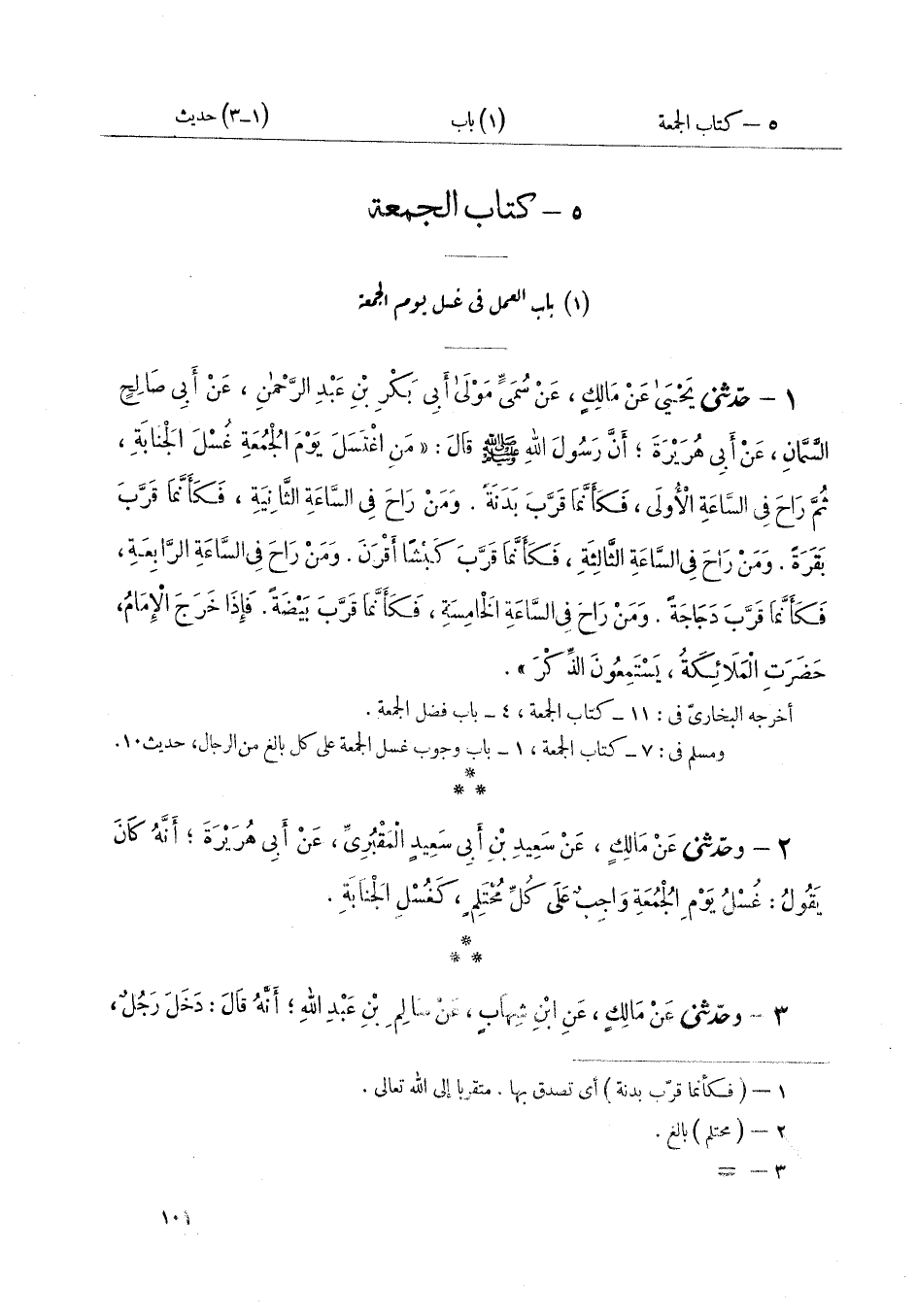 ١ - حَدَّثَنِي يَحْيَى، عَنْ مَالِكٍ، عَنْ سُمَيٍّ مَوْلَى أَبِي بَكْرِ بْنِ عَبْدِ الرَّحْمَنِ عَنْ أَبِي صَالِحٍ السَّمَّانِ عَنْ أَبِي هُرَيْرَةَ أَنَّ رَسُولَ اللَّهِ صَلَّى اللهُ عَلَيْهِ وَسَلَّمَ قَالَ: «مَنِ اغْتَسَلَ يَوْمَ الْجُمُعَةِ غُسْلَ الْجَنَابَةِ، ثُمَّ رَاحَ فِي السَّاعَةِ الْأُولَى، فَكَأَنَّمَا قَرَّبَ بَدَنَةً، وَمَنْ رَاحَ فِي السَّاعَةِ الثَّانِيَةِ فَكَأَنَّمَا قَرَّبَ بَقَرَةً، وَمَنْ رَاحَ فِي السَّاعَةِ الثَّالِثَةِ فَكَأَنَّمَا قَرَّبَ كَبْشًا أَقْرَنَ، وَمَنْ رَاحَ فِي السَّاعَةِ الرَّابِعَةِ فَكَأَنَّمَا قَرَّبَ دَجَاجَةً، وَمَنْ رَاحَ فِي السَّاعَةِ الْخَامِسَةِ فَكَأَنَّمَا قَرَّبَ بَيْضَةً، فَإِذَا خَرَجَ الْإِمَامُ حَضَرَتِ الْمَلَائِكَةُ يَسْتَمِعُونَ الذِّكْرَ»
