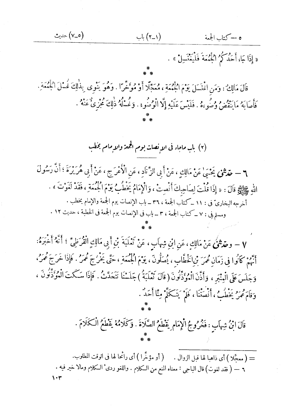 ٧ - وَحَدَّثَنِي عَنْ مَالِكٍ، عَنْ ابْنِ شِهَابٍ، عَنْ ثَعْلَبَةَ بْنِ أَبِي مَالِكٍ الْقُرَظِيِّ أَنَّهُ أَخْبَرَهُ أَنَّهُمْ كَانُوا فِي زَمَانِ عُمَرَ بْنِ الْخَطَّابِ، يُصَلُّونَ يَوْمَ الْجُمُعَةِ، حَتَّى يَخْرُجَ عُمَرُ. فَإِذَا خَرَجَ عُمَرُ، وَجَلَسَ عَلَى الْمِنْبَرِ، وَأَذَّنَ الْمُؤَذِّنُونَ - قَالَ ثَعْلَبَةُ - جَلَسْنَا نَتَحَدَّثُ. «فَإِذَا سَكَتَ الْمُؤَذِّنُونَ وَقَامَ عُمَرُ يَخْطُبُ، أَنْصَتْنَا، فَلَمْ يَتَكَلَّمْ مِنَّا أَحَدٌ» قَالَ ابْنُ شِهَابٍ: «فَخُرُوجُ الْإِمَامِ يَقْطَعُ الصَّلَاةَ، وَكَلَامُهُ يَقْطَعُ الْكَلَامَ»