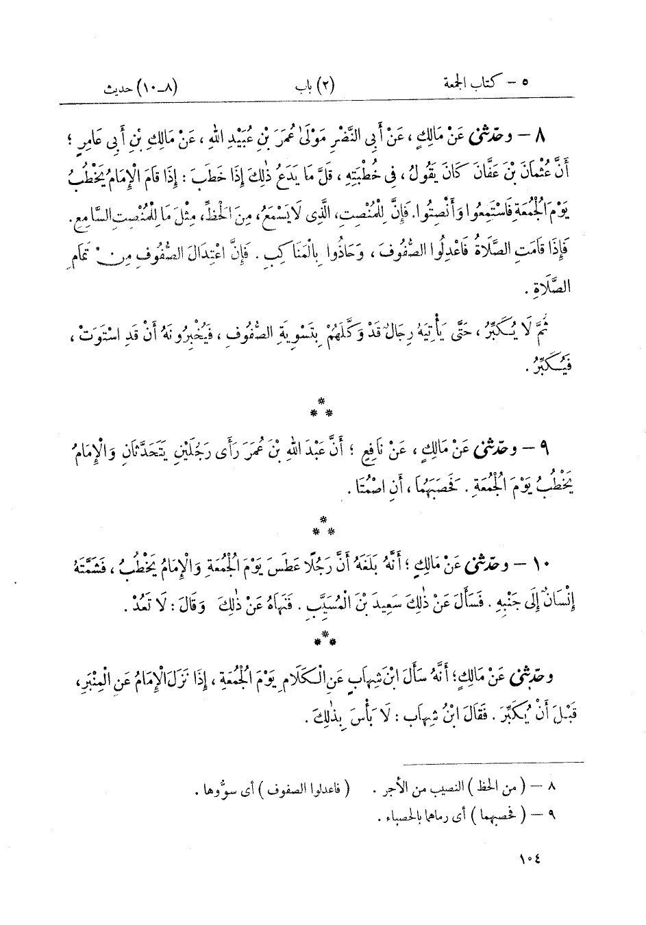 ٩ - وَحَدَّثَنِي عَنْ مَالِكٍ عَنْ نَافِعٍ، أَنَّ عَبْدَ اللَّهِ بْنَ عُمَرَ «رَأَى رَجُلَيْنِ يَتَحَدَّثَانِ وَالْإِمَامُ يَخْطُبُ يَوْمَ الْجُمُعَةِ فَحَصَبَهُمَا أَنِ اصْمُتَا»