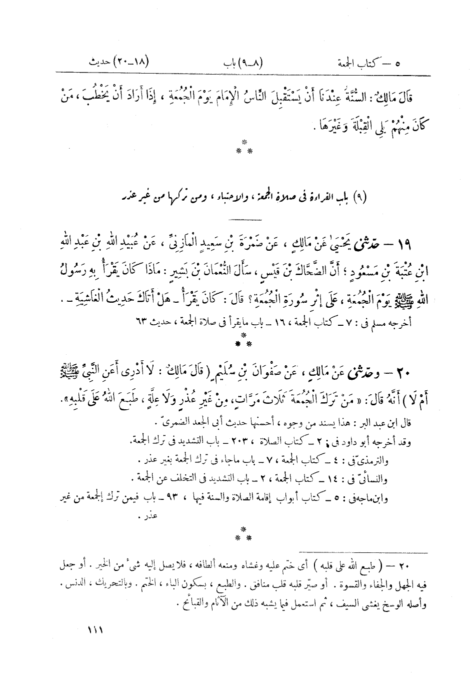 ٢٠ - وَحَدَّثَنِي عَنْ مَالِكٍ، عَنْ صَفْوَانَ بْنِ سُلَيْمٍ قَالَ مَالِكٌ: لَا أَدْرِي أَعَنِ النَّبِيِّ صَلَّى اللهُ عَلَيْهِ وَسَلَّمَ أَمْ لَا؟ أَنَّهُ قَالَ: «مَنْ تَرَكَ الْجُمُعَةَ ثَلَاثَ مَرَّاتٍ، مِنْ غَيْرِ عُذْرٍ وَلَا عِلَّةٍ، طَبَعَ اللَّهُ عَلَى قَلْبِهِ»