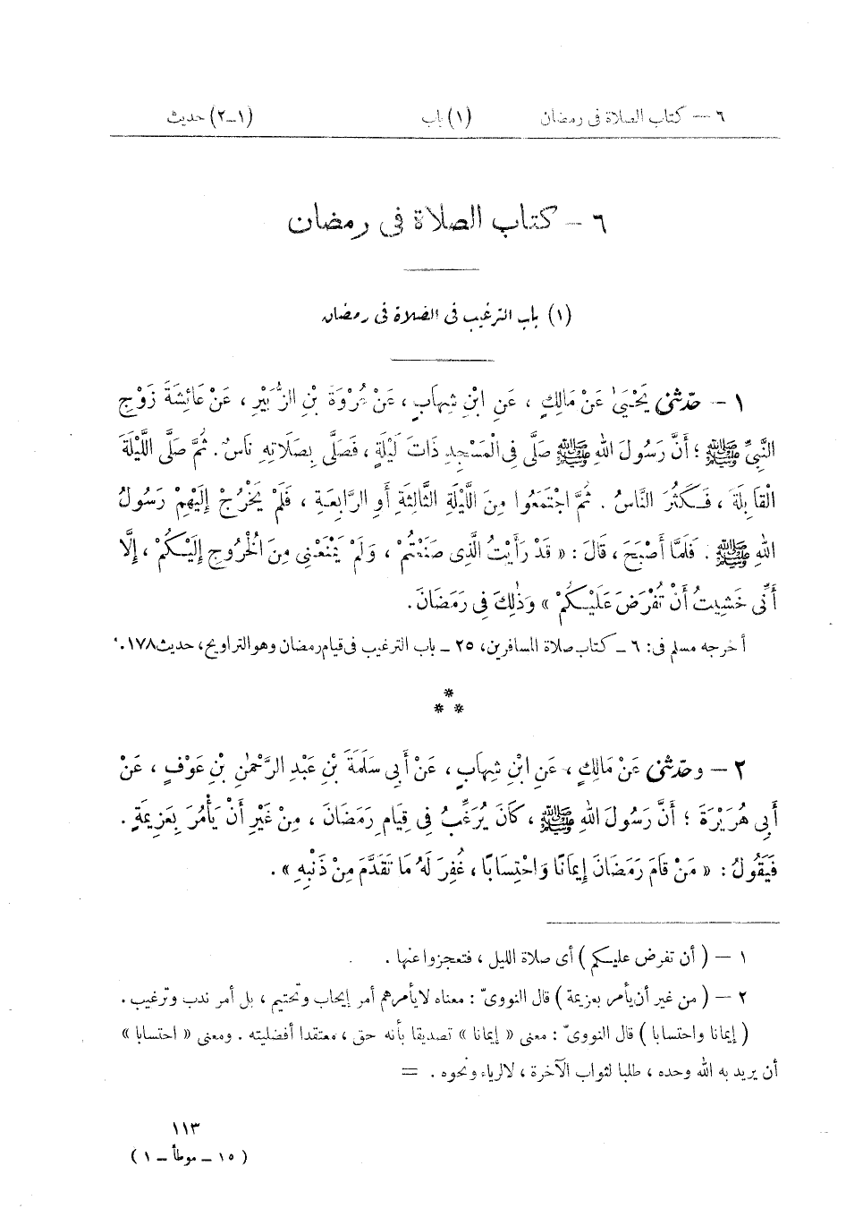 ١ - حَدَّثَنِي يَحْيَى، عَنْ مَالِكٍ، عَنْ ابْنِ شِهَابٍ، عَنْ عُرْوَةَ بْنِ الزُّبَيْرِ، عَنْ عَائِشَةَ زَوْجِ النَّبِيِّ صَلَّى اللهُ عَلَيْهِ وَسَلَّمَ، أَنَّ رَسُولَ اللَّهِ صَلَّى اللهُ عَلَيْهِ وَسَلَّمَ صَلَّى فِي الْمَسْجِدِ ذَاتَ لَيْلَةٍ، فَصَلَّى بِصَلَاتِهِ نَاسٌ. ثُمَّ صَلَّى اللَّيْلَةَ الْقَابِلَةَ، فَكَثُرَ النَّاسُ. ثُمَّ اجْتَمَعُوا مِنَ اللَّيْلَةِ الثَّالِثَةِ أَوِ الرَّابِعَةِ، فَلَمْ يَخْرُجْ إِلَيْهِمْ رَسُولُ اللَّهِ صَلَّى اللهُ عَلَيْهِ وَسَلَّمَ. فَلَمَّا أَصْبَحَ، قَالَ: «قَدْ رَأَيْتُ الَّذِي صَنَعْتُمْ، وَلَمْ يَمْنَعْنِي مِنَ الْخُرُوجِ إِلَيْكُمْ، إِلَّا أَنِّي خَشِيتُ أَنْ تُفْرَضَ عَلَيْكُمْ» وَذَلِكَ فِي رَمَضَانَ