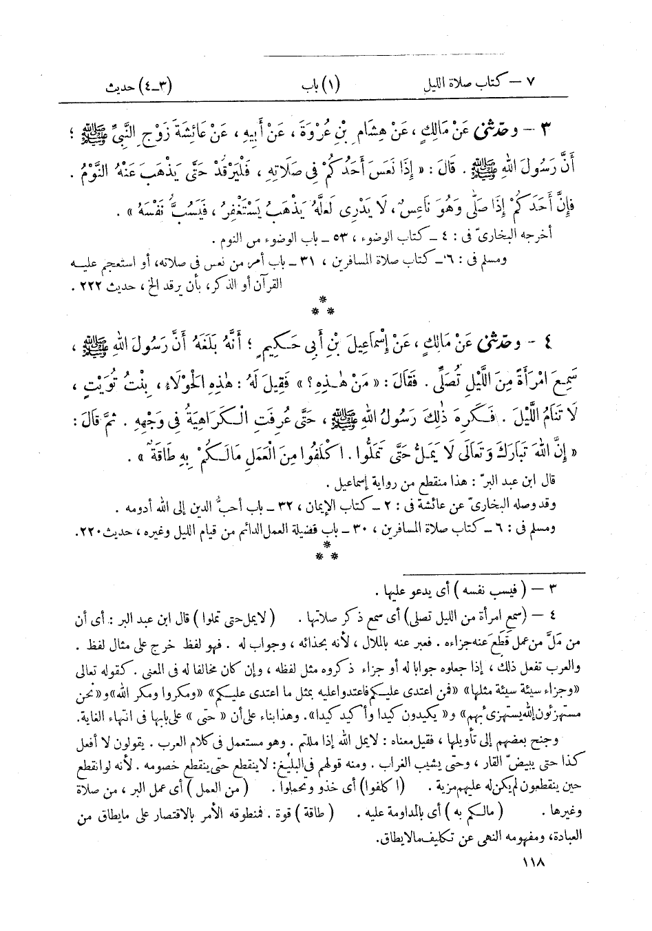 ٣ - وَحَدَّثَنِي عَنْ مَالِكٍ، عَنْ هِشَامِ بْنِ عُرْوَةَ عَنْ أَبِيهِ، عَنْ عَائِشَةَ زَوْجِ النَّبِيِّ صَلَّى اللهُ عَلَيْهِ وَسَلَّمَ، أَنَّ رَسُولَ اللَّهِ صَلَّى اللهُ عَلَيْهِ وَسَلَّمَ قَالَ: «إِذَا نَعَسَ أَحَدُكُمْ فِي صَلَاتِهِ، فَلْيَرْقُدْ حَتَّى يَذْهَبَ عَنْهُ النَّوْمُ، فَإِنَّ أَحَدَكُمْ إِذَا صَلَّى وَهُوَ نَاعِسٌ، لَا يَدْرِي لَعَلَّهُ يَذْهَبُ يَسْتَغْفِرُ فَيَسُبَّ نَفْسَهُ»