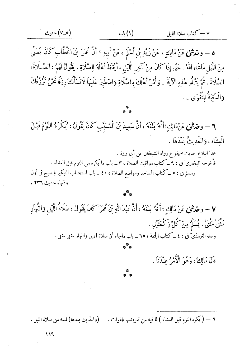 ٧ - وَحَدَّثَنِي عَنْ مَالِكٍ أَنَّهُ بَلَغَهُ أَنَّ عَبْدَ اللَّهِ بْنَ عُمَرَ كَانَ يَقُولُ: «صَلَاةُ اللَّيْلِ وَالنَّهَارِ مَثْنَى مَثْنَى، يُسَلِّمُ مِنْ كُلِّ رَكْعَتَيْنِ» قَالَ مَالِكٌ: «وَهُوَ الْأَمْرُ عِنْدَنَا»