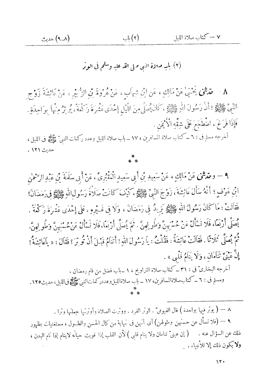 ٩ - وَحَدَّثَنِي عَنْ مَالِكٍ، عَنْ سَعِيدِ بْنِ أَبِي سَعِيدٍ الْمَقْبُرِيِّ، عَنْ أَبِي سَلَمَةَ بْنِ عَبْدِ الرَّحْمَنِ بْنِ عَوْفٍ، أَنَّهُ سَأَلَ عَائِشَةَ زَوْجَ النَّبِيِّ صَلَّى اللهُ عَلَيْهِ وَسَلَّمَ، كَيْفَ كَانَتْ صَلَاةُ رَسُولِ اللَّهِ صَلَّى اللهُ عَلَيْهِ وَسَلَّمَ فِي رَمَضَانَ؟ فَقَالَتْ: مَا كَانَ رَسُولُ اللَّهِ صَلَّى اللهُ عَلَيْهِ وَسَلَّمَ يَزِيدُ فِي رَمَضَانَ، وَلَا فِي غَيْرِهِ، عَلَى إِحْدَى عَشْرَةَ رَكْعَةً. يُصَلِّي أَرْبَعًا، فَلَا تَسْأَلْ عَنْ حُسْنِهِنَّ وَطُولِهِنَّ، ثُمَّ يُصَلِّي أَرْبَعًا، فَلَا تَسْأَلْ عَنْ حُسْنِهِنَّ وَطُولِهِنَّ، ثُمَّ يُصَلِّي ثَلَاثًا. فَقَالَتْ عَائِشَةُ: فَقُلْتُ: يَا رَسُولَ اللَّهِ أَتَنَامُ قَبْلَ أَنْ تُوتِرَ؟ فَقَالَ: «يَا عَائِشَةُ إِنَّ عَيْنَيَّ تَنَامَانِ وَلَا يَنَامُ قَلْبِي»